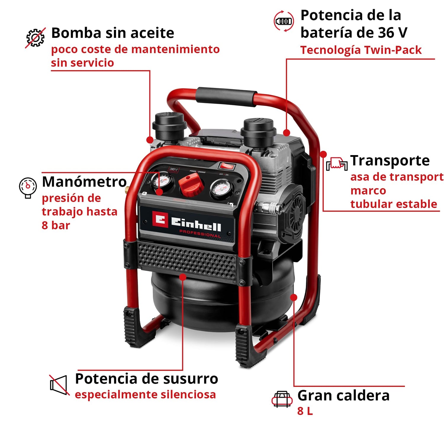 Einhell Professional Compresor con batería SILENZZO 36/210 Power X-Change (36 V, máx. 8 bar, depósito de 8 l, potencia de aspiración 210 l/min, manómetro, sin aceite, silencioso, sin batería)