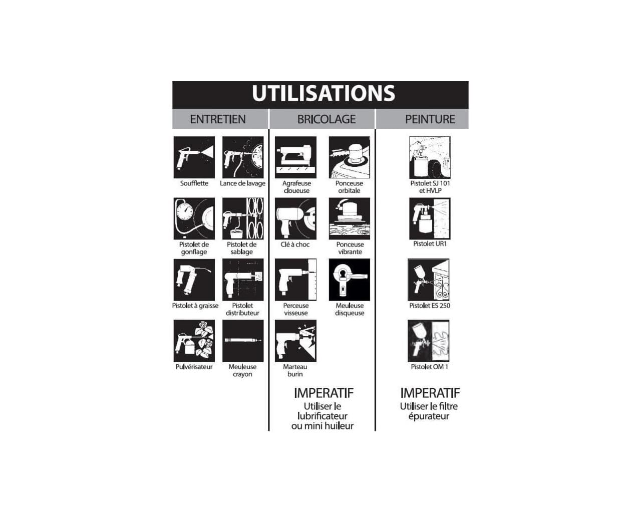 - Ideal para soplar, lavar, inflar, arena, pulverizar, grabar, clavar, lijar, taladrar, atornillar/desenroscar (llave de impacto), moler, cincel, pintar.