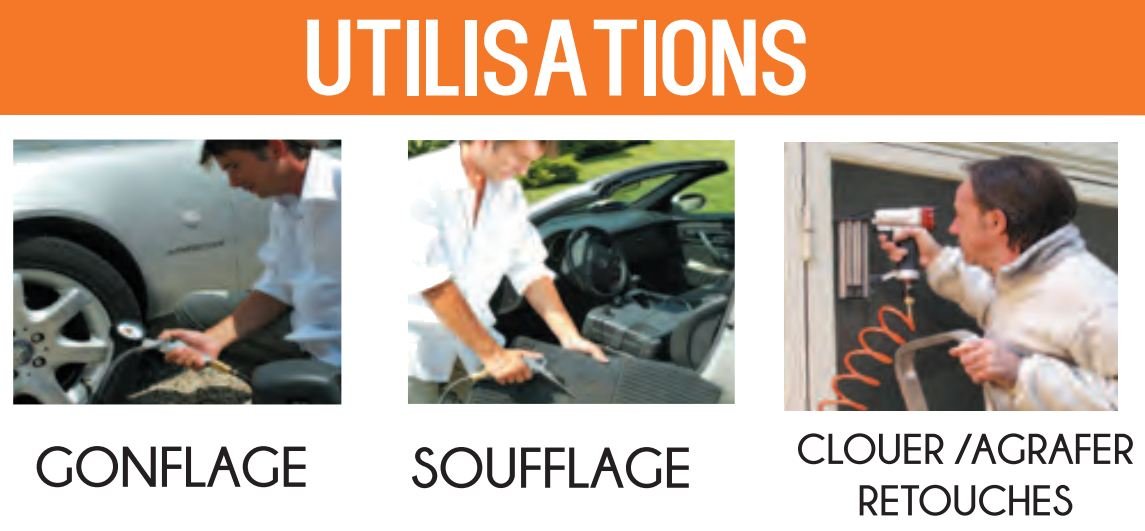 Detalles: Compresor de aire 1,5 CV 2 litros. Compacto y ligero. Herramientas logés en un compartimento integrado con cubeta de 2 litros. Dispositivo de regulación a distancia exclusivo que permite ajustar la presión de trabajo al más cerca de la herramienta, de ahorro de tiempo. Incluye: asa de inflado homologadas, nivel sonoro: 94dB, soufflette boquilla corto, metal - 3 boquillas de inflado, manguera goma 5 m, regulador de presión y 2 manomètres.