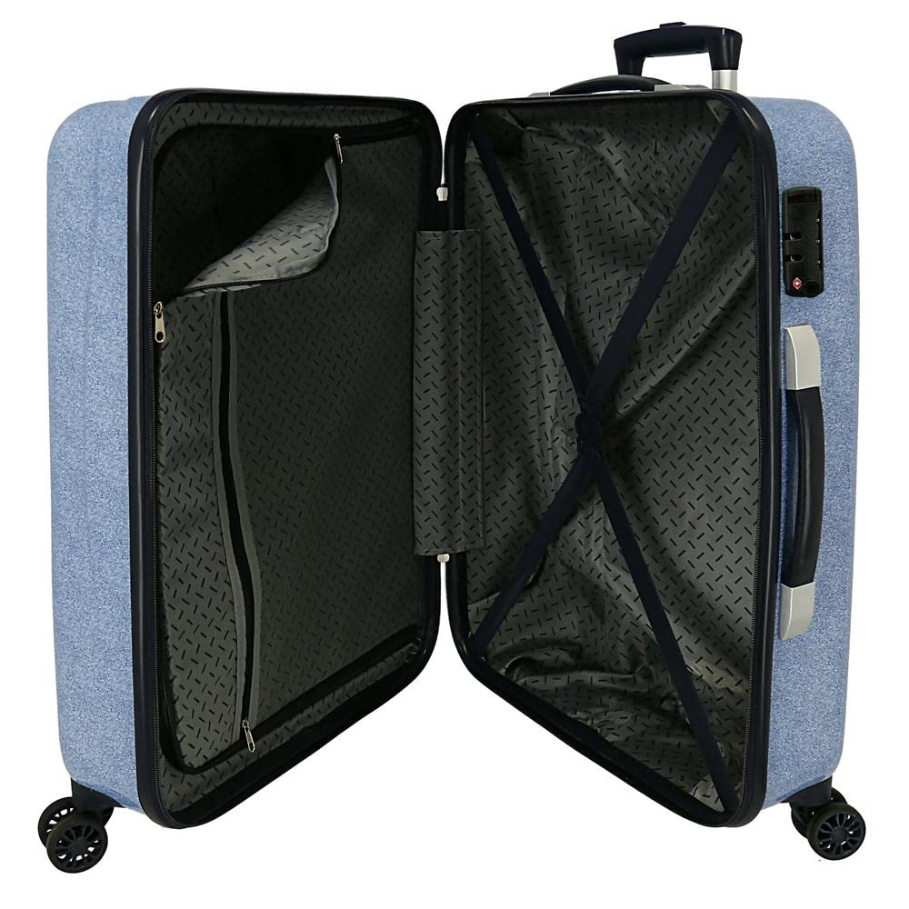 - Maleta de 68 cm x 48 cm x 26 cm (ruedas y asa incluida). Tiene una capacidad de 70L y pesa 3,7 kg. Fabricada en ABS, un material rígido y ligero.