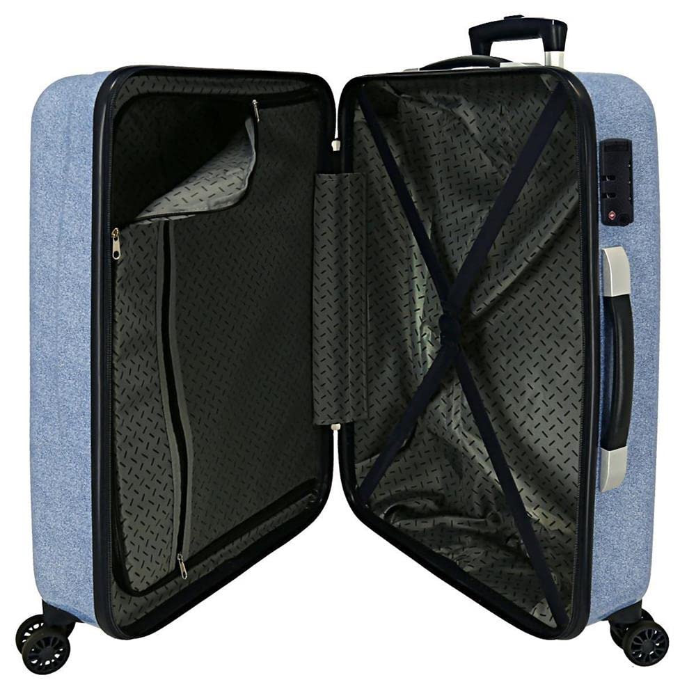 - Maleta Mediana de 46 cm x 65 cm x 23 cm (ruedas y asa incluida). Tiene una capacidad de 56L y pesa 3,1 kg. Fabricada en ABS, un material resistente y ligero.