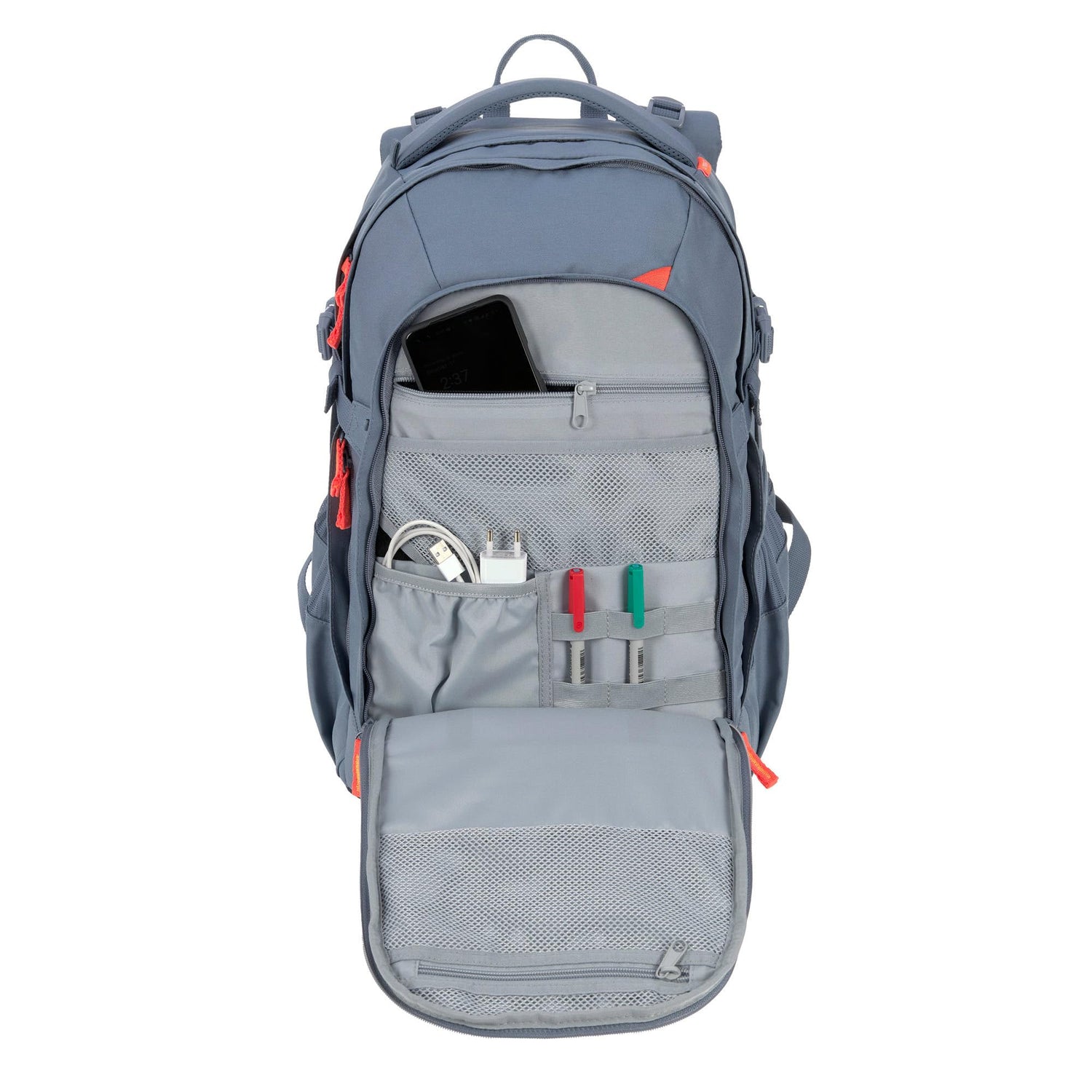 - Además de los amplios compartimentos principales, la mochila tiene prácticos compartimentos para cuadernos A5, libros y tu tableta. Especialmente importante: el compartimento adicional para el smartphone y la batería con salida para auriculares. Los grandes bolsillos laterales ofrecen espacio para una botella de agua o un paraguas