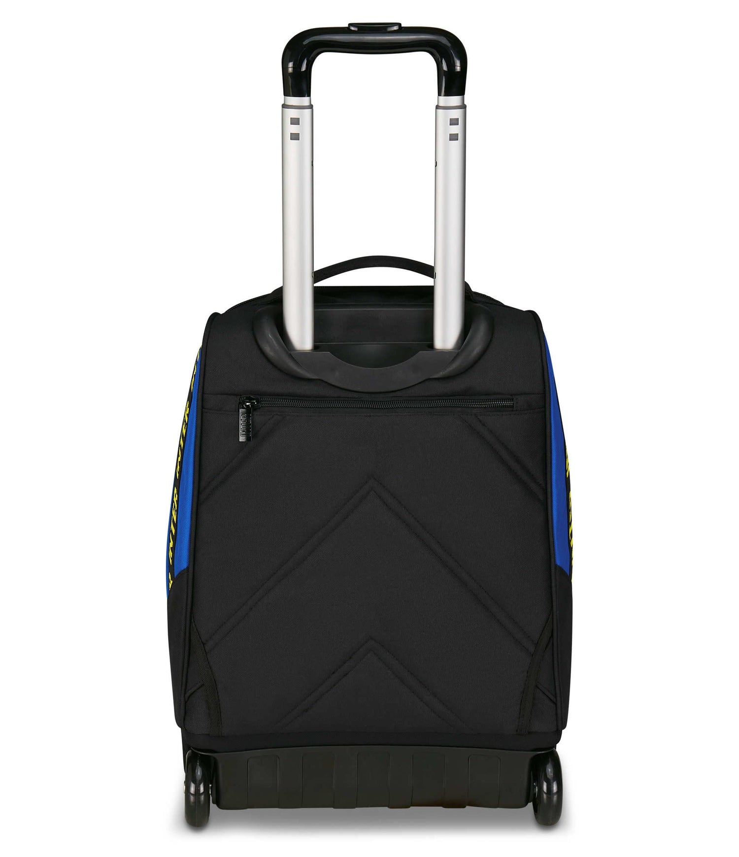 - Trolley doble compartimento con bolsillo frontal. Barra telescópica de doble barra. Patas antivuelco. Carcasa a prueba de golpes. Ruedas de 75 mm. Elástico interior para botella.