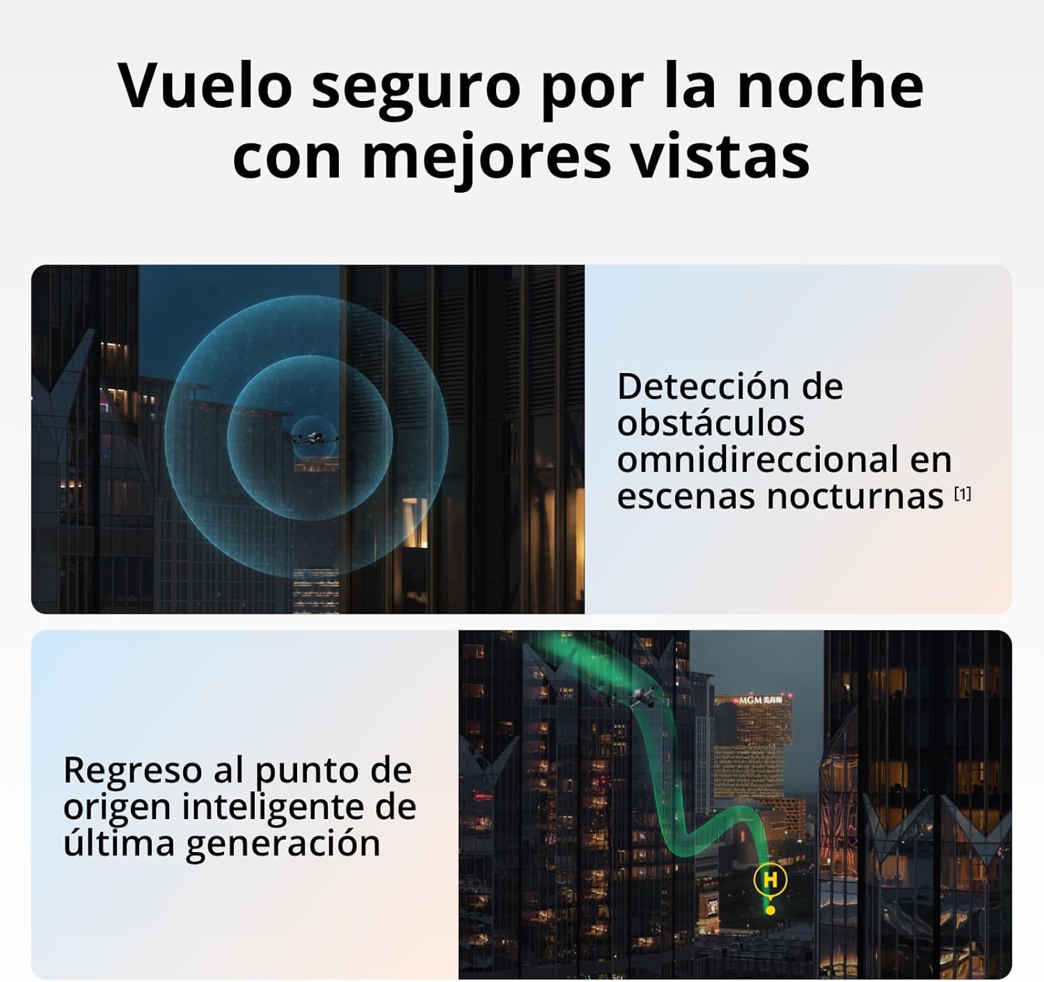 - Más seguridad al volar por la noche - El LiDAR orientado hacia delante y sensores adicionales habilitan la detección de obstáculos omnidireccional en escenas nocturnas, para que tu dron pueda esquivar edificios mientras vuela. [1]