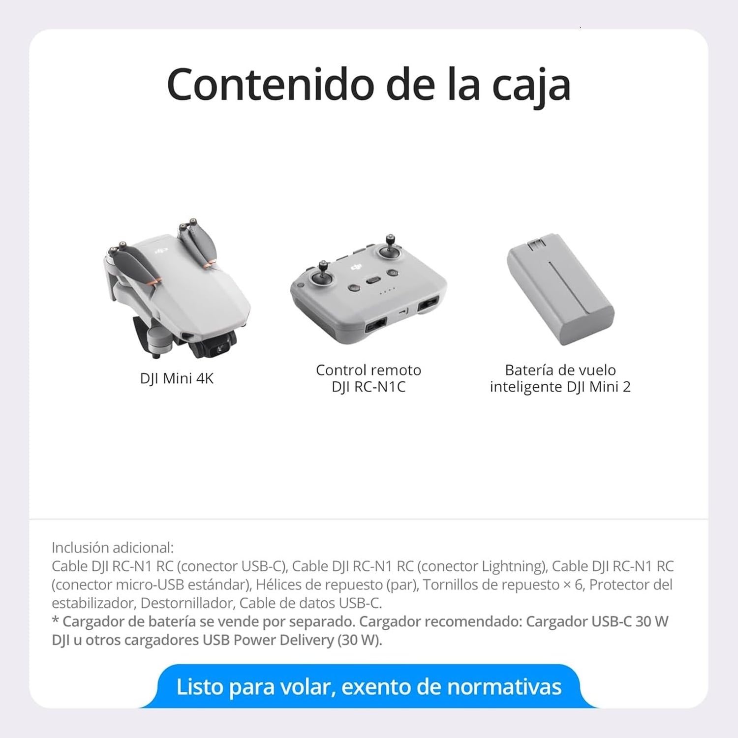 - Incluye DJI Mini 4K, 1 batería, un RC-N1C y todo lo que necesitas para volar fácilmente grabando en 4K. Una opción genial y asequible para principiantes.