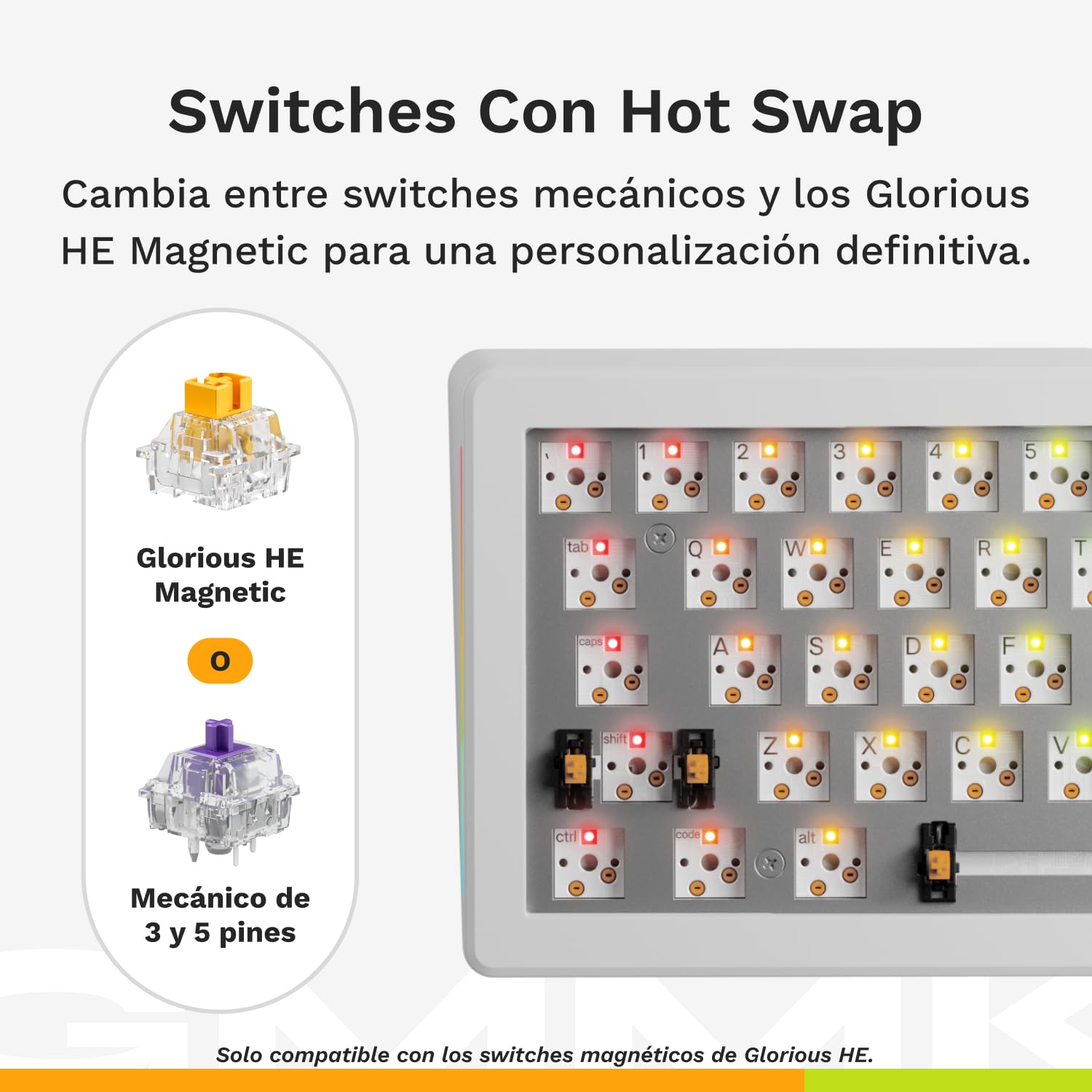 - Switches Glorious Fox HE: switches lineales magnéticos para gaming con tacto suave, acciones personalizables y capacidad de respuesta rápida, para recibir respuesta al instante en los juegos más vertiginosos.