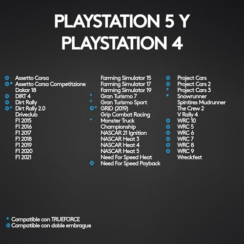 • G923 para Playstation funciona con la mayoría de juegos de carreras en PS5, PS4, PC; disfruta de títulos selectos diseñados para TRUEFORCE, y descarga Logitech G HUB para disfrutar de la experiencia