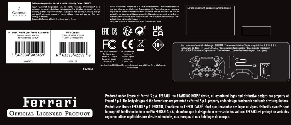 Detalles: La última creación resultante de décadas de colaboración entre Thrustmaster y Ferrari, este producto es una réplica a escala 1:1 del volante del legendario monoplaza de carreras Ferrari SF1000. El Thrustmaster Formula Wheel Add-On Ferrari SF1000 Edition incluye el etiquetado icónico y las marcas oficiales que se encuentran en el volante real, así como una pantalla LCD IPS de 109 mm que muestra hasta 69 elementos de información de conducción. El panel de carreras incorpora diferentes aspectos para el tipo de juego que se está usando o el automóvil que se conduce, y 21 LED: 15 para la velocidad del motor y 2 x 3 para las banderas del comisario de carrera. La estructura 100% de fibra de carbono de la placa frontal del volante proporciona un Force Feedback equilibrado para lograr movimientos extremadamente precisos en carrera, especialmente en juegos enfocados en los monoplazas. Los agarres de goma con textura y las levas de cambio de marchas intercambiables Thrustmaster T-Chrono Paddles (se venden por separado) hacen de este volante réplica una herramienta verdaderamente versátil para las carreras, que puede adaptarse para satisfacer las necesidades de cada piloto. Con licencia oficial de Ferrari, el volante es compatible con todas las bases de volante de carreras Thrustmaster T-Series (se venden por separado), y es totalmente funcional en PC (Windows 10), PlayStation 4, 5, Xbox One, Xbox Series X y Xbox Series S.