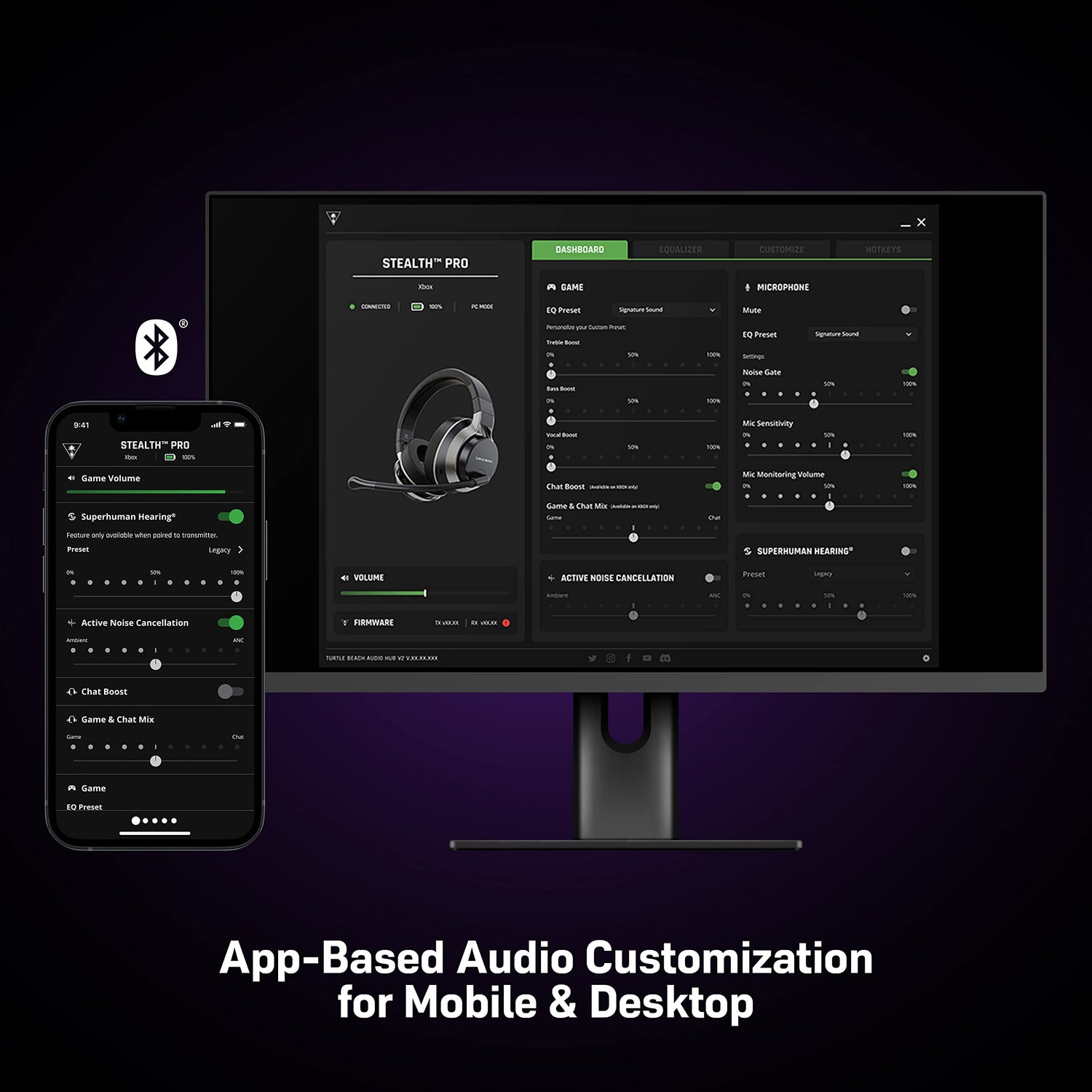 - Cancelación de ruido activa sin igual - Disfruta de la cancelación de ruido más versátil y competitiva que jamás hayan tenido unos cascos de gaming, con niveles de reducción de ruido de hasta 25 dB; lleva cuatro micrófonos internos con cancelación de ruido que reducen el ruido hasta 25 dB, por lo que el Stealth Pro se adapta a cualquier situación, tanto si quieres desconectarte de las distracciones como si quieres acentuar los sonidos ambientales para conseguir una transparencia de ruido casi completa; la cancelación de ruido se puede ajustar con la aplicación Turtle Beach Audio Hub o mediante la rueda de volumen de los auriculares