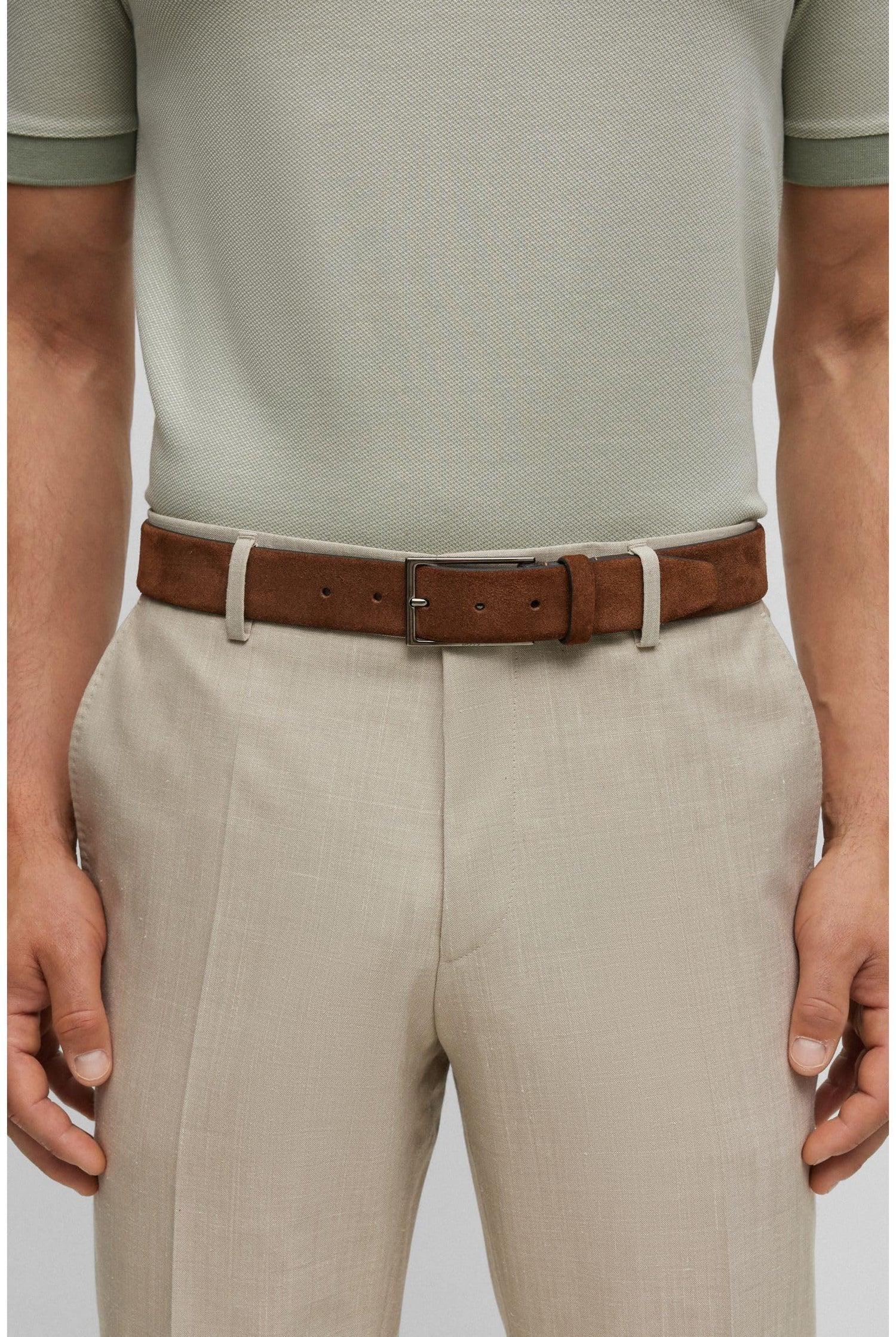Cinturón para hombre confeccionado en ante y óptimo para uso diario. Cierre con una hebilla delgada adornada con logo grabado y una presilla de piel.
