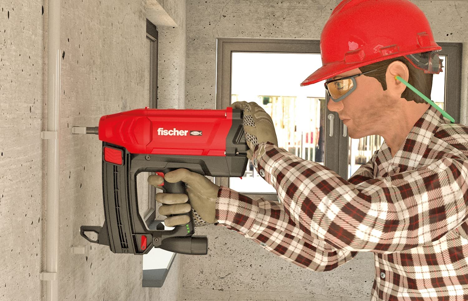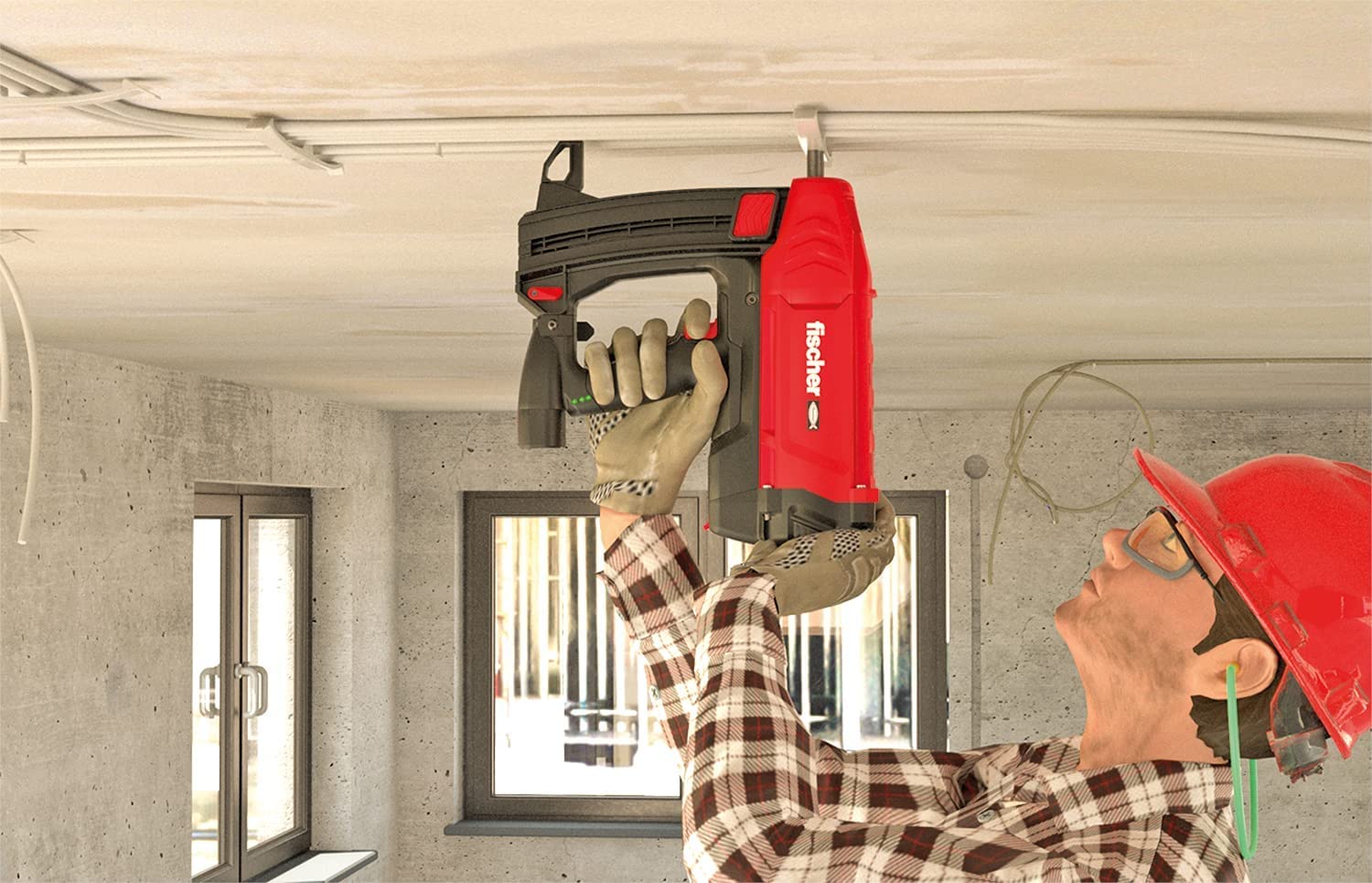 FISCHER, Pistola de clavos, clavadora electrica a gas FGC 100 para fijación de chapa, perfiles, yeso y acero, con dos baterías de 7,2V y 3Ah a 2 disparos por segundo