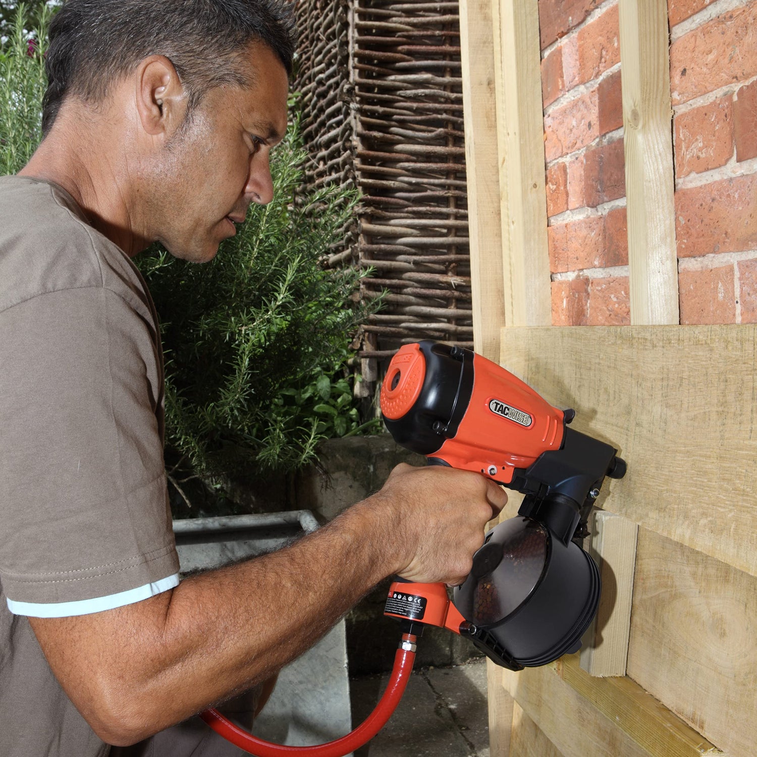 - VARIEDAD DE APLICACIONES - Pistola de clavos en bobina profesional adecuada para una amplia gama de aplicaciones industriales, incluida la fabricación de palés, cajas y cajones, colocación de tejados, vallas, entramados de madera, revestimientos y fachadas, así como la construcción de cobertizos y edificios de jardín