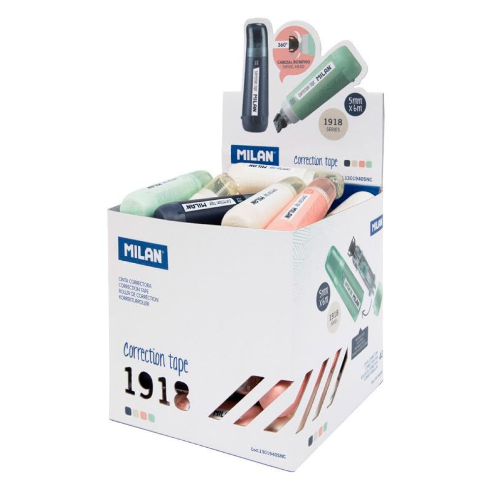 Detalles: Milan 1918 Cubo Expositor de 40 Cintas Correctoras Cilindricas - Medidas 5x6m - Rotacion de Punta 360º - Colores Surtidos