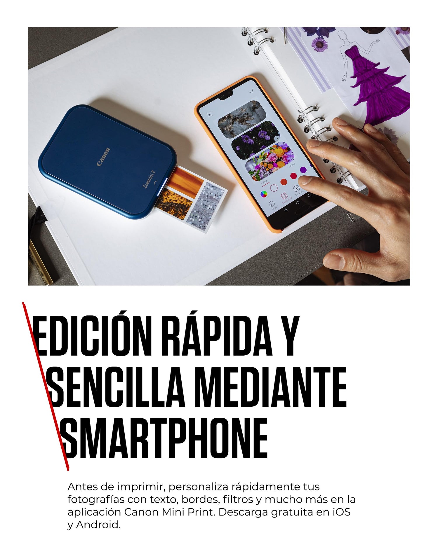 Detalles: Vive la libertad de imprimir fotos al instante con el Canon Zoemini 2 Printing Kit, la impresora portátil perfecta para quienes fotografían con el móvil. Esta impresora compacta e inalámbrica se conecta fácilmente a tu smartphone mediante Bluetooth 5.0 y te permite imprimir fotos vibrantes y resistentes a las manchas en cualquier momento y lugar, gracias a la tecnología ecológica ZINK (Zero Ink), sin necesidad de cartuchos de tinta. Con la app Canon Mini Print, podrás personalizar tus fotos con textos, marcos y filtros para convertir cada recuerdo en una creación única. El Kit de Impresión de Canon Zoemini 2 incluye todo lo que necesitas para empezar: 30 hojas de papel fotográfico adhesivo Canon ZINK y 20 adhesivos redondos, ideales para scrapbooking, decorar tu habitación o crear regalos personalizados. Además, con la función de mosaico podrás unir varias impresiones y crear posters sorprendentes. Esta impresora instantánea para smartphone es perfecta para llevar de viaje, con carga rápida por USB C y múltiples accesorios. Descubre la magia de imprimir sin cables y da rienda suelta a tu creatividad, tu estilo y tus recuerdos. Con este completo kit, convierte los momentos más fugaces de la vida en recuerdos que duran para siempre.