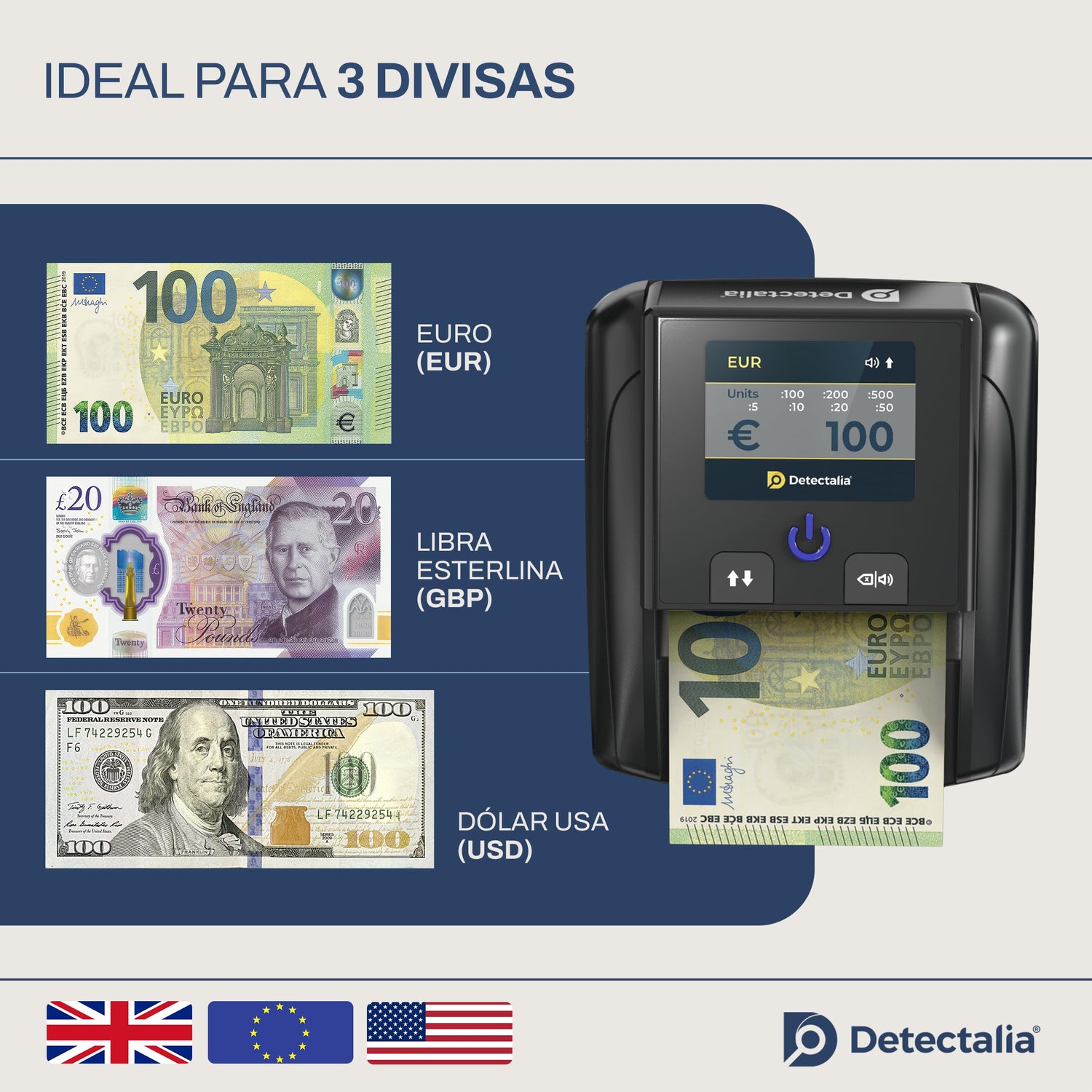 - Compatible con todos los billetes de las divisas EUR. GBP y USD, tanto los antiguos como los nuevos