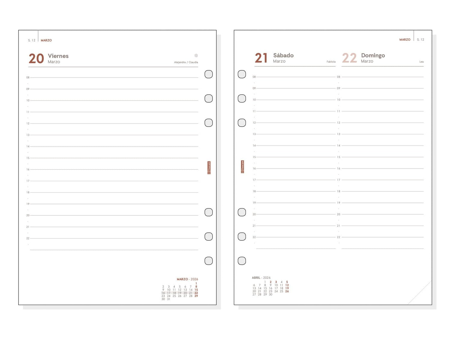 - INTERIOR: 1 Día Página. Amplio espacio de escritura para cada día. Con horas desde las 8:00h hasta las 22:00h. Idioma del artículo: español. Con información de los festivos de España.
