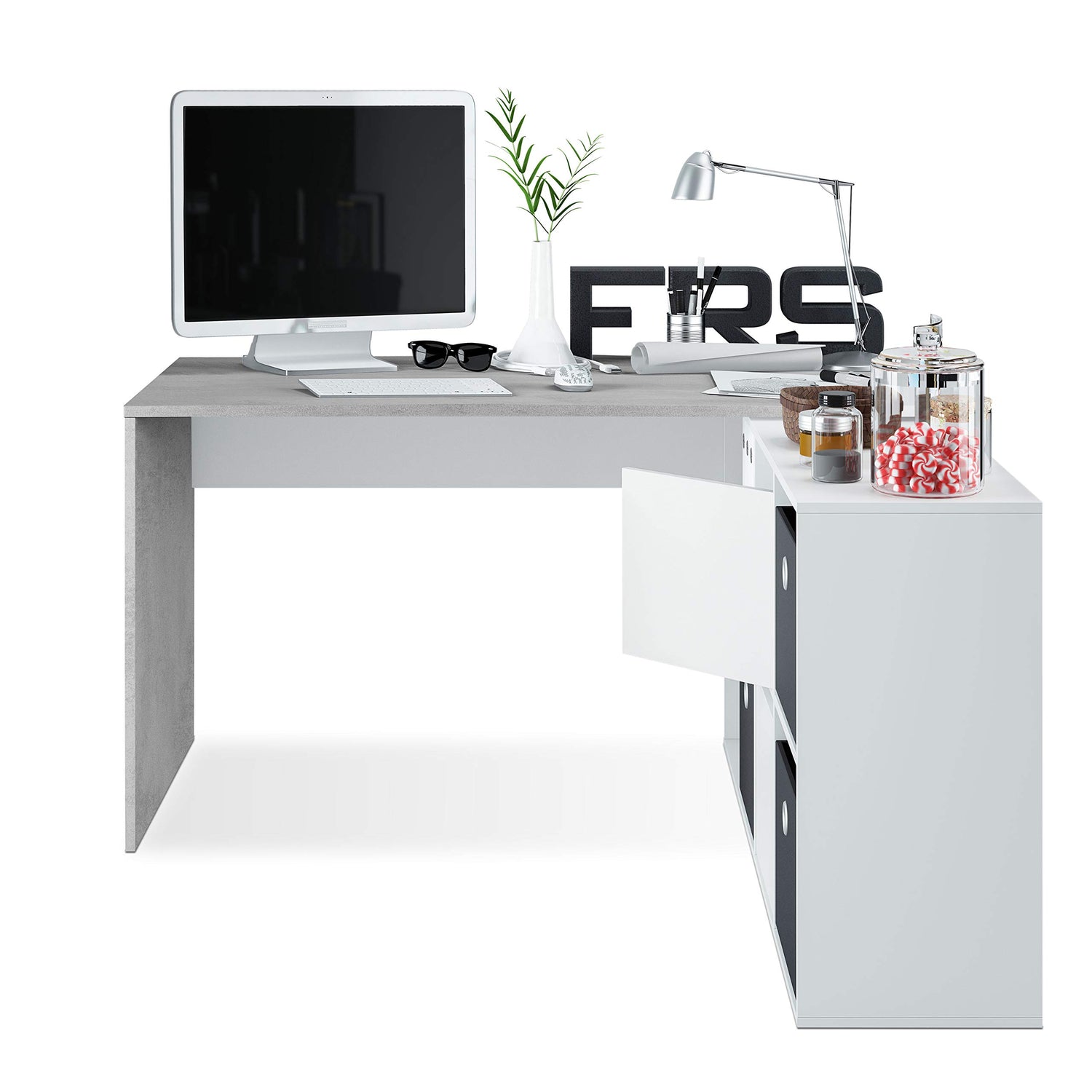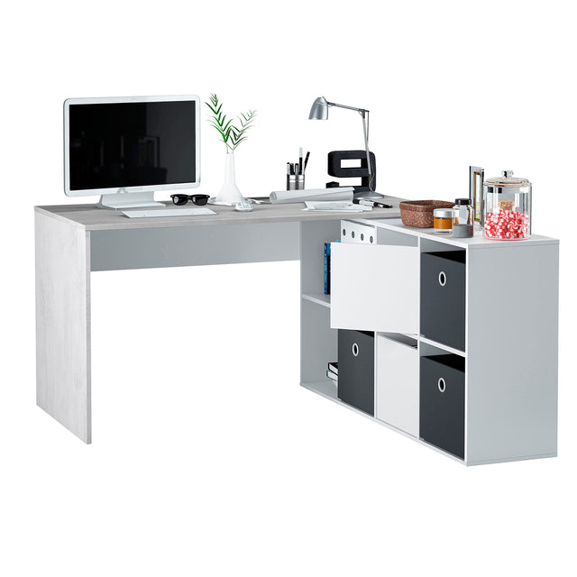 Habitdesign Escritorio Multiposición Reversible, Mesa Estudio, Mesa PC, Modelo Adapta XL, Acabado en Blanco Artik y Gris Cemento, 74 x 136 x 139 cm