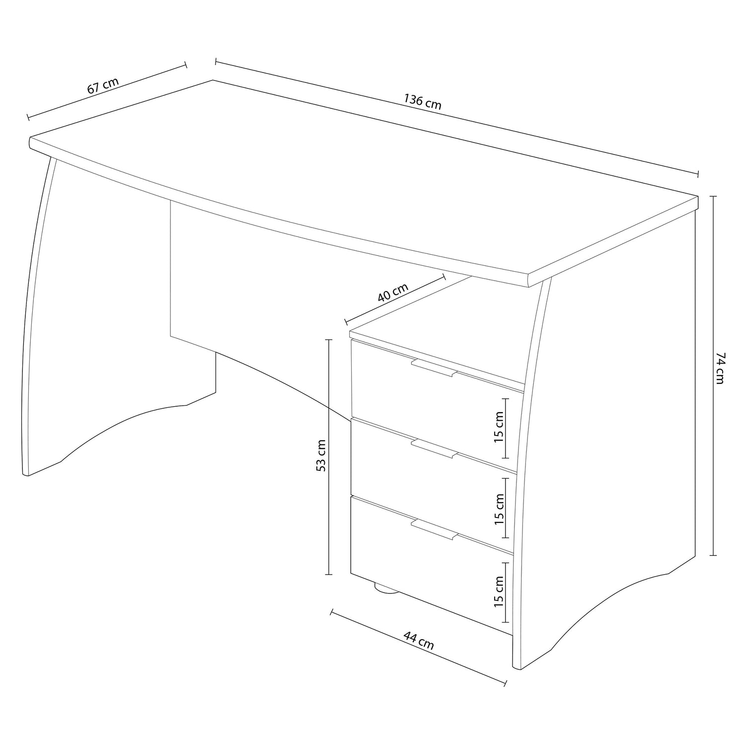 - Mesa de despacho modelo Estil con buc de 3 cajones. La mesa de oficina presenta una estructura muy robusta y sólida, gracias a sus patas continuas y un tablero central que va de lado a lado de la mesa para darle más estabilidad. Incluye tiradores metálicos y patas en ABS para la cajonera. La mesa no es reversible, el buc siempre va montado a la derecha.