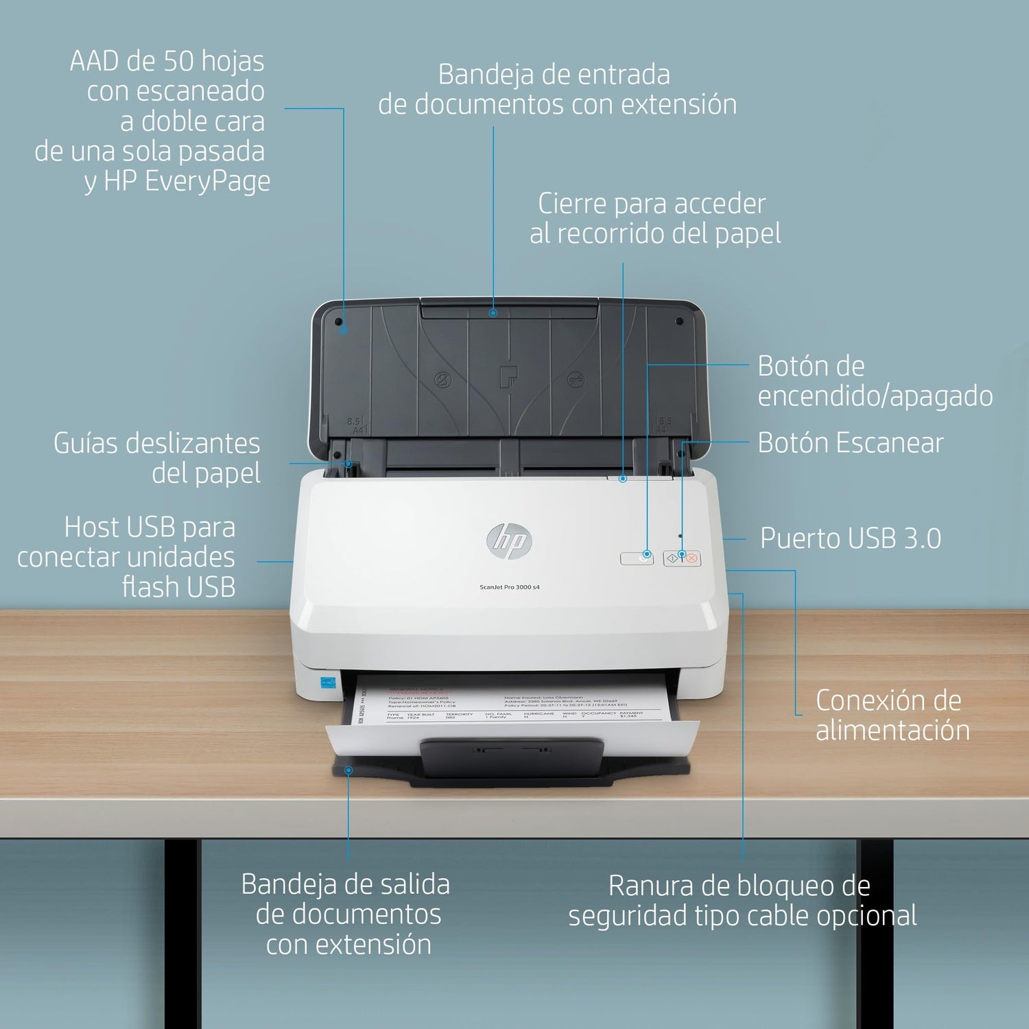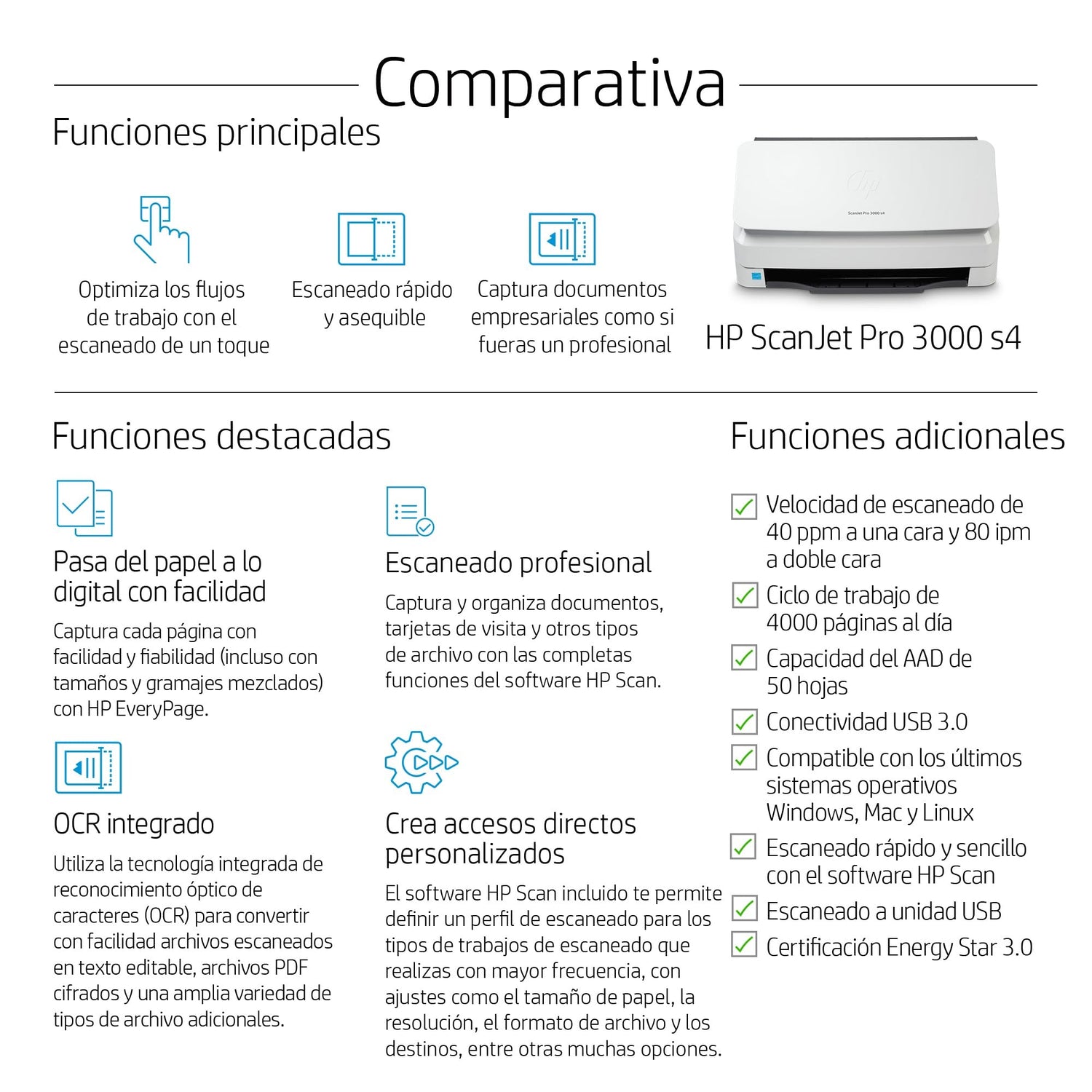 Detalles: HP ScanJet Pro 3000 s4 (6FW07A) - Escáner con alimentador de hojas. Rápido, asequible y diseñado para gestionarlo todo: desde trabajos sencillos en color a flujos de trabajo complejos. Digitaliza de forma rápida y fiable los proyectos más grandes con velocidades de escaneado de hasta 40 ppm/80 ipm y un AAD de 50 páginas. Recomendado para 4000 páginas al día.