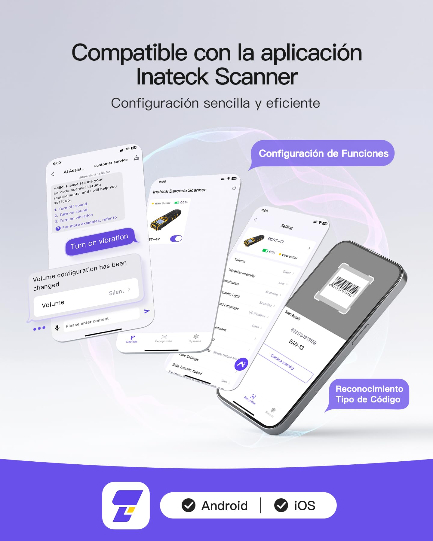 - Control APP y SDK para varios lenguajes de programación: Puede configurar rápidamente el escáner a través de la aplicación, haciendo la operación más conveniente. Las características comunes como el reconocimiento de tipos de códigos de barras, la conexión y gestión de Bluetooth, la visualización del estado de la batería, las preferencias de alerta y la configuración de tipos de códigos de barras son fácilmente accesibles en la aplicación, ofreciendo mayor eficiencia y conveniencia