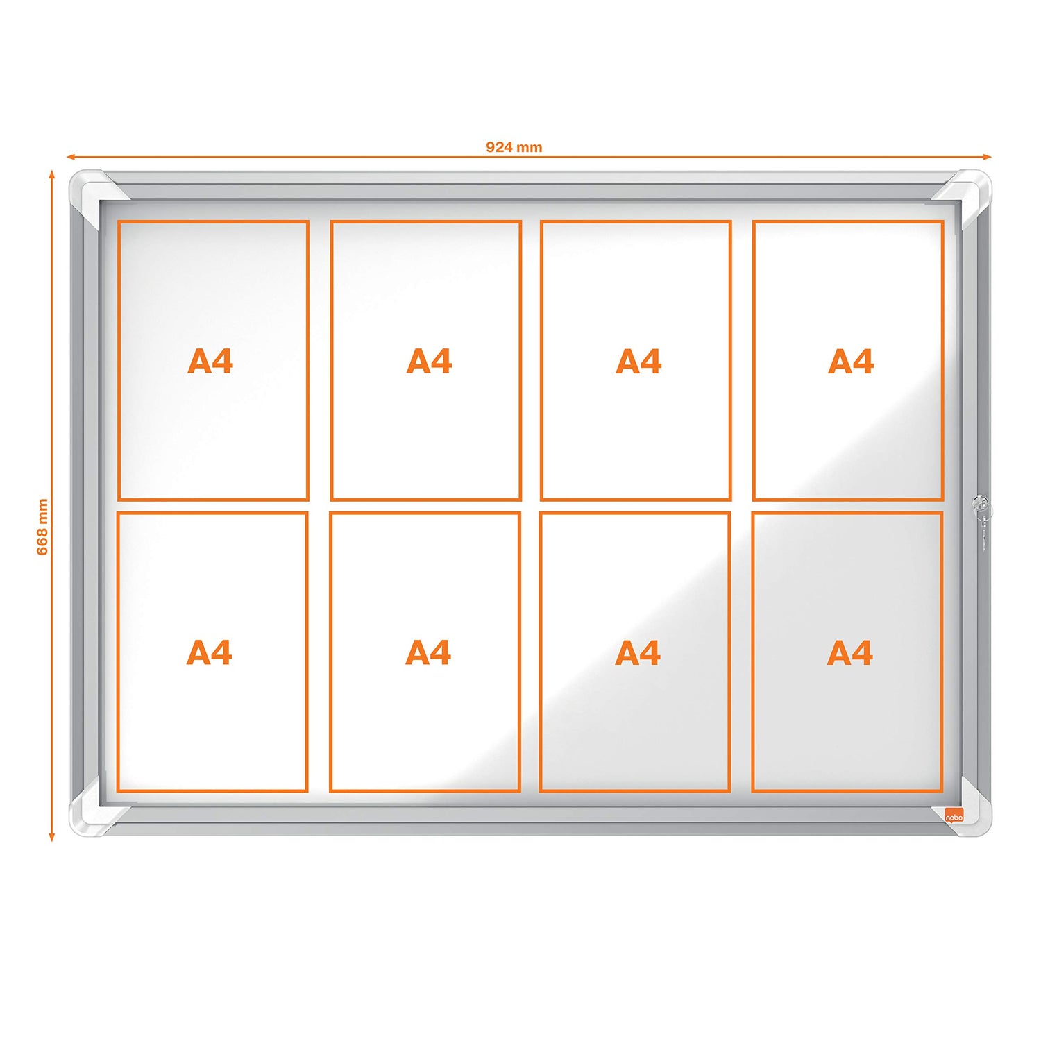 - La vitrina magnética con cerradura incluye un moderno y elegante marco de aluminio con capacidad para 8 hojas A4 (924 x 668mm) para ofrecer espacio para documentos, calendarios y mucho más