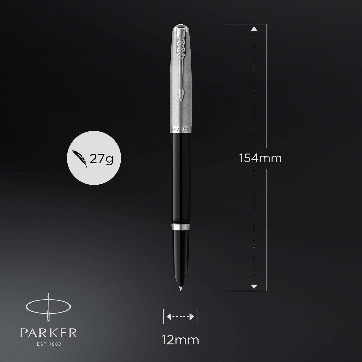 - Presenta un cuerpo de resina resistente, precioso y brillante de color negro, así como un capuchón y unos adornos acabados en acero inoxidable con el emblemático clip en forma de flecha de Parker