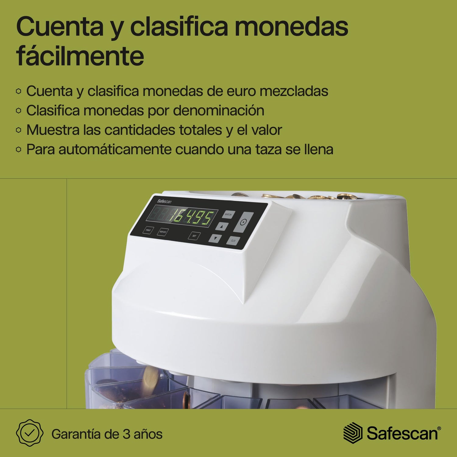 - PRECISO CONTEO Y CLASIFICACIÓN DE MONEDAS: procese sus monedas en un abrir y cerrar de ojos; la contadora Safescan 1250 cuenta rápidamente el valor de las monedas de euro mezcladas y las clasifica con precisión por denominación; en cuestión de minutos tendrá una visión completa de todas las monedas contadas y organizadas lista para añadir a su administración
