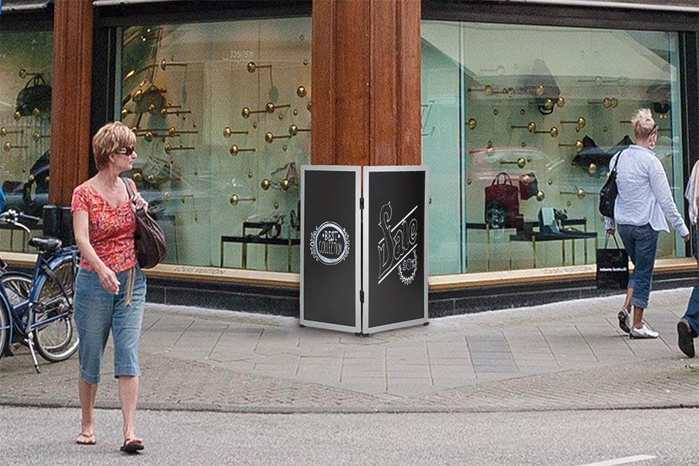 Detalles: La tabla Securit Multi Board es una herramienta de comunicación dinámica de ventas. Es una pizarra modular que se puede montar en una pared, en la acera, en el interior, en el exterior y en una serie de combinaciones. La tabla Securit Multi Board ofrece infinitas posibilidades. Se puede utilizar individualmente o en múltiples, usted decide el tamaño y el diseño. Use tres tablas para formar un triángulo para una comunicación de 360 grados, o use varias tablas en una fila para actuar como un separador de terraza. Cada tabla viene con un par de patas y bisagras de goma. Las patas metálicas se venden por separado. La tabla Securit Multi Board es adecuada para interiores y exteriores, es resistente al agua y a los rayos UV y tiene una superficie resistente a los arañazos. El cuadro está disponible en un acabado plateado, negro o blanco. Se recomienda utilizar marcadores de tiza líquida Securit para una fácil escritura y limpieza y sin dejar marcas en la superficie una vez limpiadas. Los marcadores de tiza líquida Securit son resistentes a las rebabas, el agua, la decoloración, las manchas y los arañazos y se venden por separado. Dimensiones (alto x ancho): 115 x 60 cm.