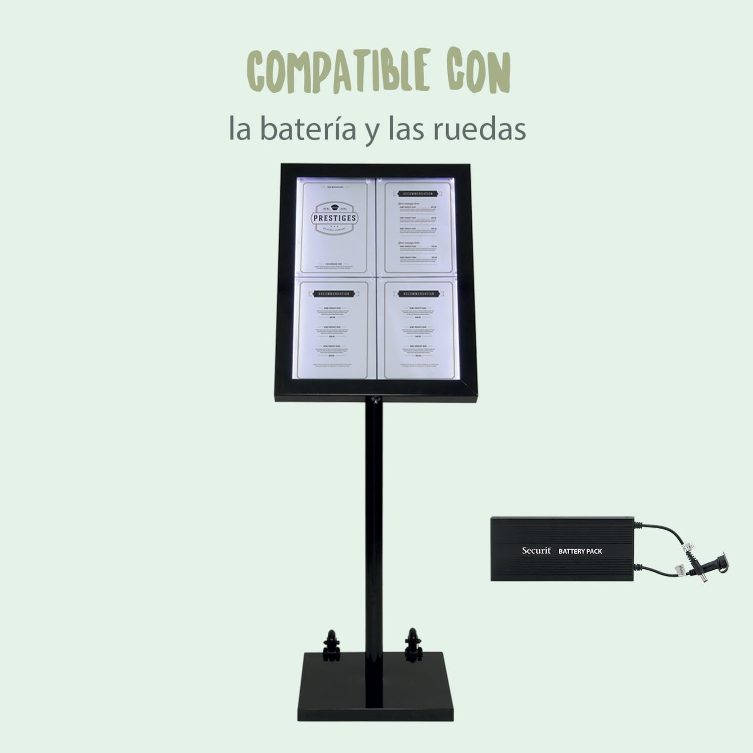 • PORTA FOLLETO ILUMINADO CON SOPORTE: Este panel de exhibición capaz de contener hasta 4 páginas A4 está equipado con iluminación LED blanca para una visualización óptima de la información.