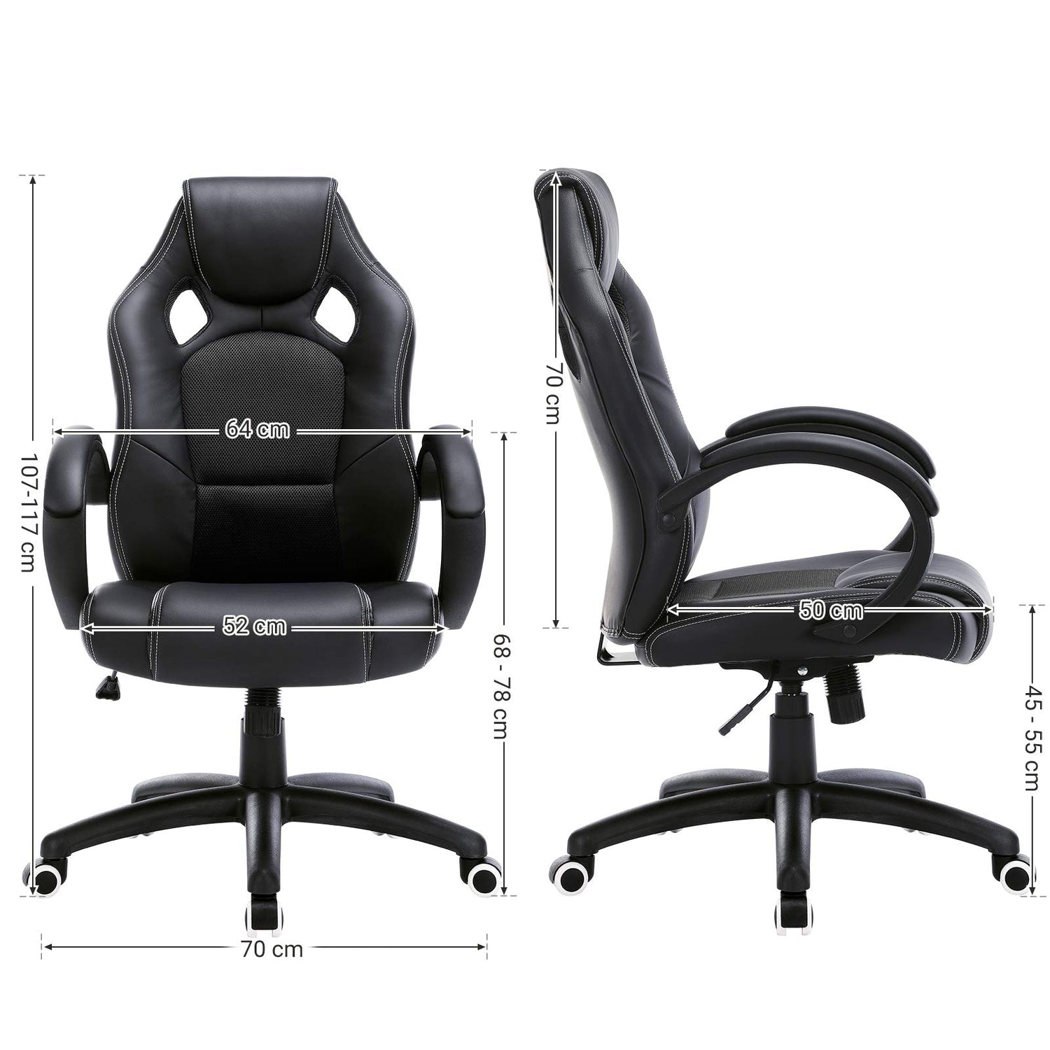 SONGMICS Racing Silla de Escritorio de Oficina Ergonómica Regulable con Ruedas, OBG56B, Negro, 776732