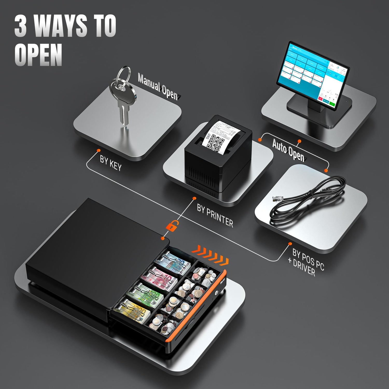 - 【Conectividad y compatibilidad】 Conecte la caja registradora a una impresora térmica/de recibos a través de un cable RJ12 (incluido en el paquete), luego conecte la impresora a su POS para abrir/cerrar automáticamente la bandeja de efectivo. Compatible con la mayoría de las principales marcas de impresoras térmicas/de recibos. (Sin puerto USB, por lo que NO se puede conectar a POS directamente a través de USB); Apto para uso doméstico y comercial, como, supermercados, farmacias, etc.