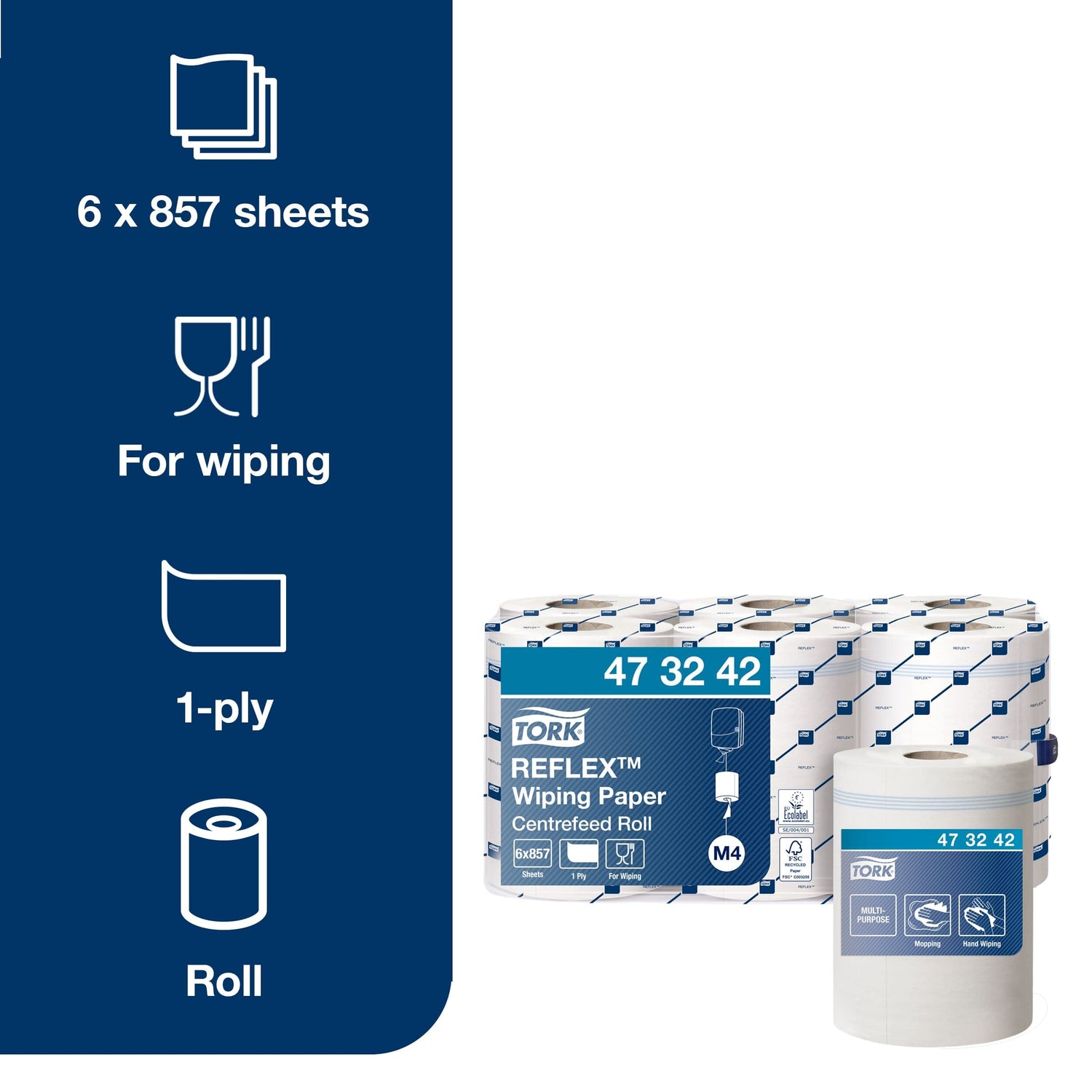 Tork 473242 Papel de secado Reflex/Advanced / 1 capa/Paños de limpieza compatibles con el sistema M4 / 6 bobinas x 300 m de largo/color blanco