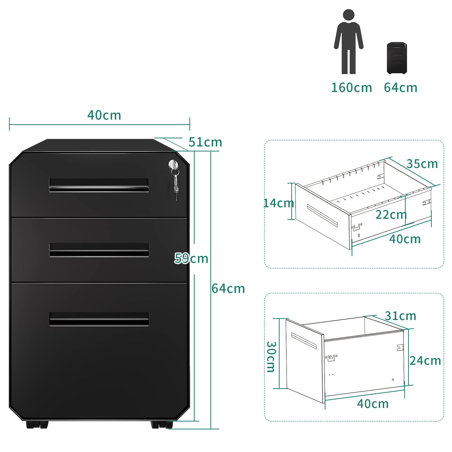 - DISEÑO DE 5 RUEDAS, ANTIVUELCO - El archivador móvil cuenta con 2 ruedas con freno, 2 ruedas giratorias a 360° y 1 rueda de repuesto para una movilidad óptima; el archivador bloqueable con 1 cerradura y 2 llaves puede asegurar todos los cajones de la oficina; el archivador con bloqueo tiene un mecanismo de seguridad para evitar el vuelco, por lo que solo se puede abrir un cajón a la vez.