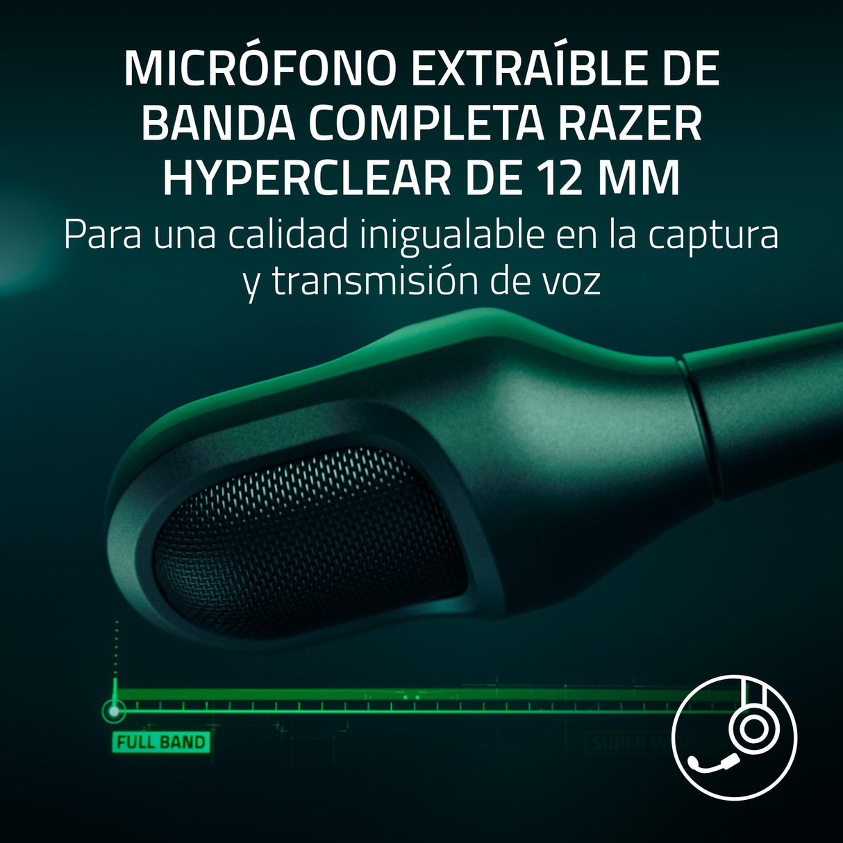 - Micrófono extraíble de banda completa Razer HyperClear de 12 mm - para una calidad inigualable en la captura y transmisión de voz: Armado con una gran cápsula de 12 mm, este micrófono de banda completa de última generación capta con claridad cada detalle de todas tus comunicaciones y suprime eficazmente el ruido de fondo con un patrón de captación unidireccional.