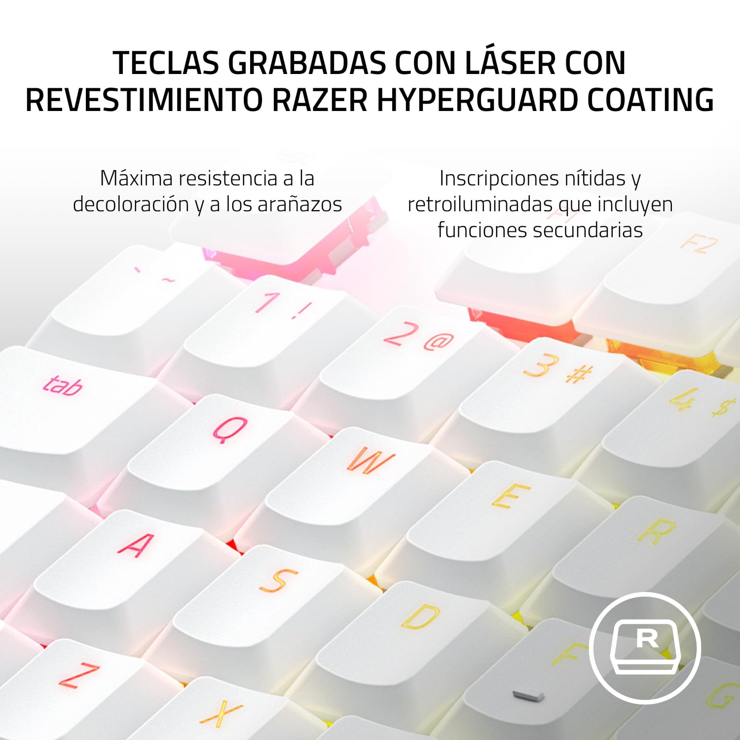 - Teclas grabadas con láser con revestimiento HyperGuard para una máxima resistencia Razer la decoloración y a los arañazos: ofrece una protección ideal contra el desgaste en comparación con las teclas normales, con leyendas grabadas con láser que se ven más nítidas y permanecen bien iluminadas incluso durante el día.