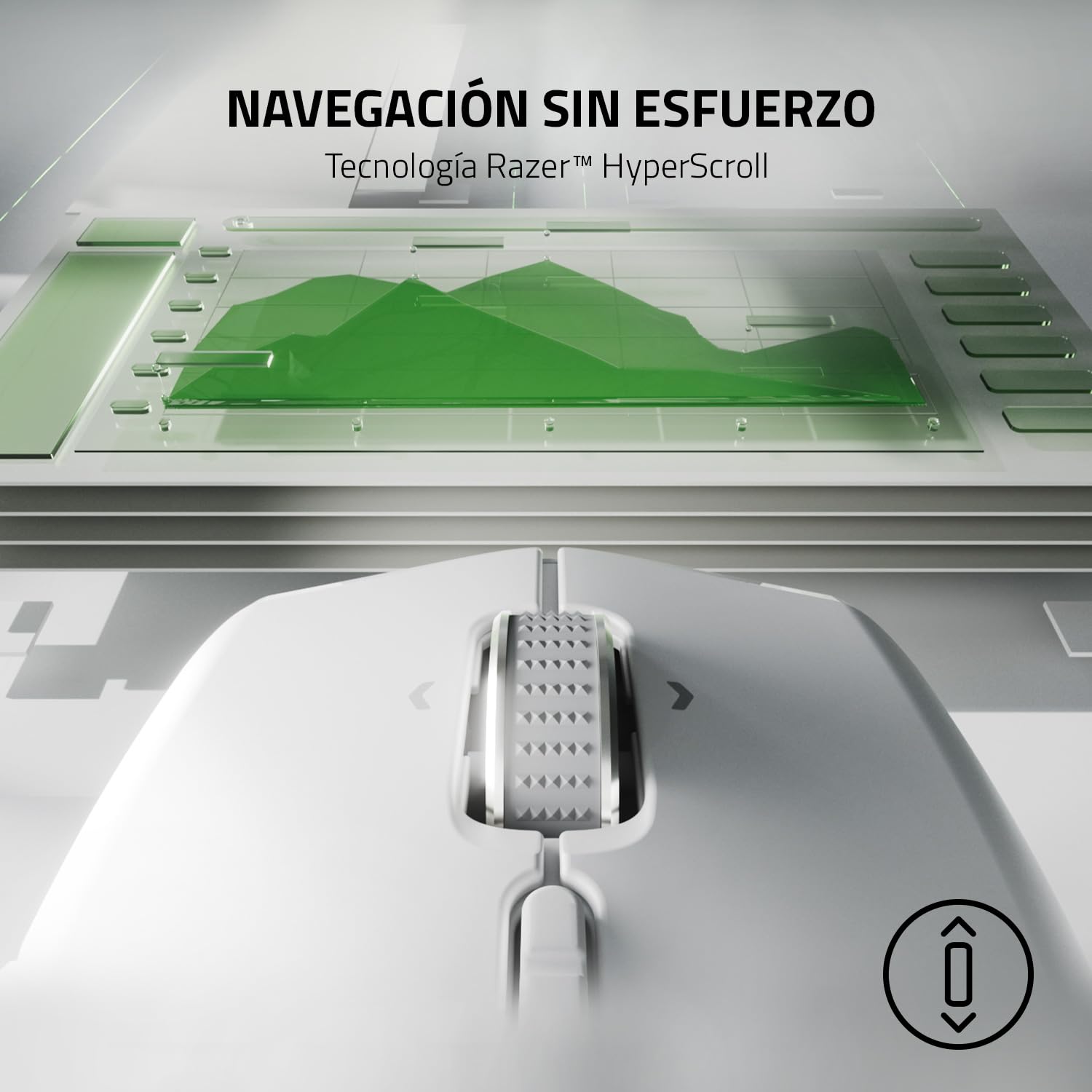 - Navegación sin esfuerzo Tecnología Razer HyperScroll: Desplázate fácilmente con una rueda de desplazamiento que te permite cambiar entre el modo de giro libre cuando navegues por páginas web o documentos largos, el modo dentado cuando quieras más precisión y la inclinación de la rueda para desplazarte en horizontal.