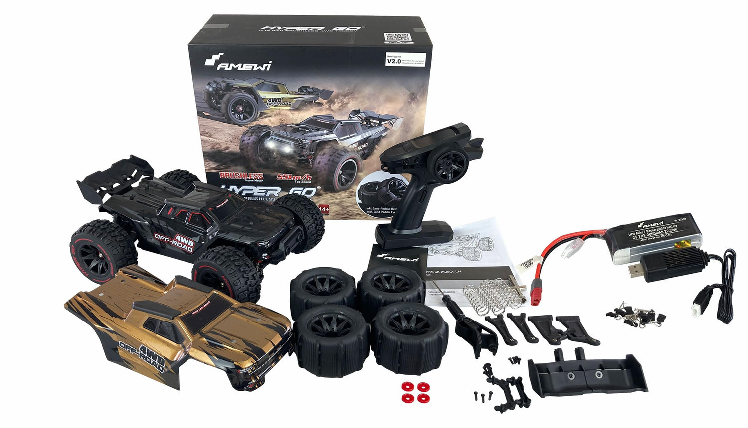Amewi Hyper GO Truggy sin escobillas 4WD 1:14 RTR Negro Incluye Barra de Ruedas, Piezas de Repuesto, carrocería Dorada