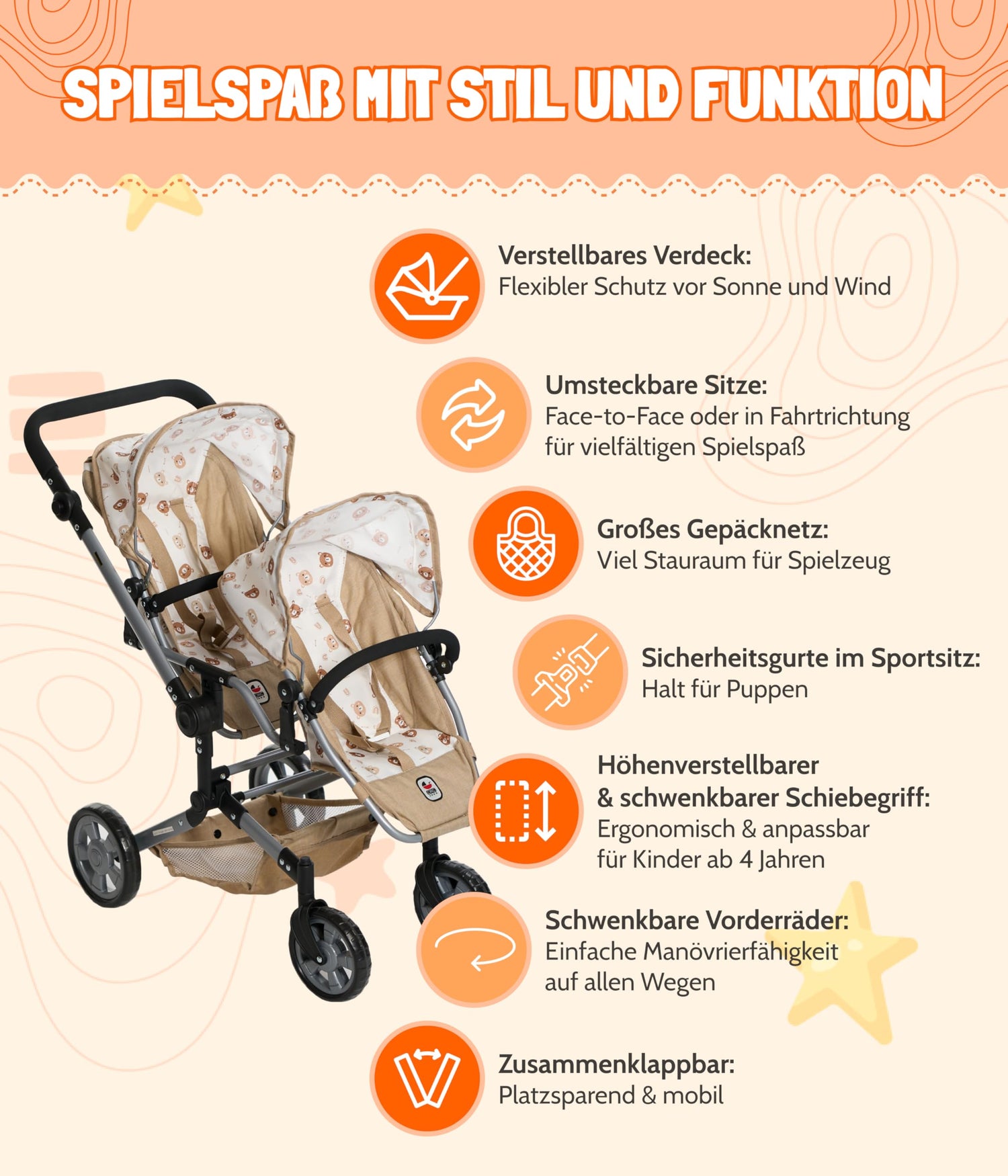 Bayer Chic 2000® Cochecito para muñecas Linus Duo – Osos Beige – Cochecito Doble Plegable – Mango Ajustable 50 – 82 cm – Muñecas de hasta 50 cm – 4-8 años
