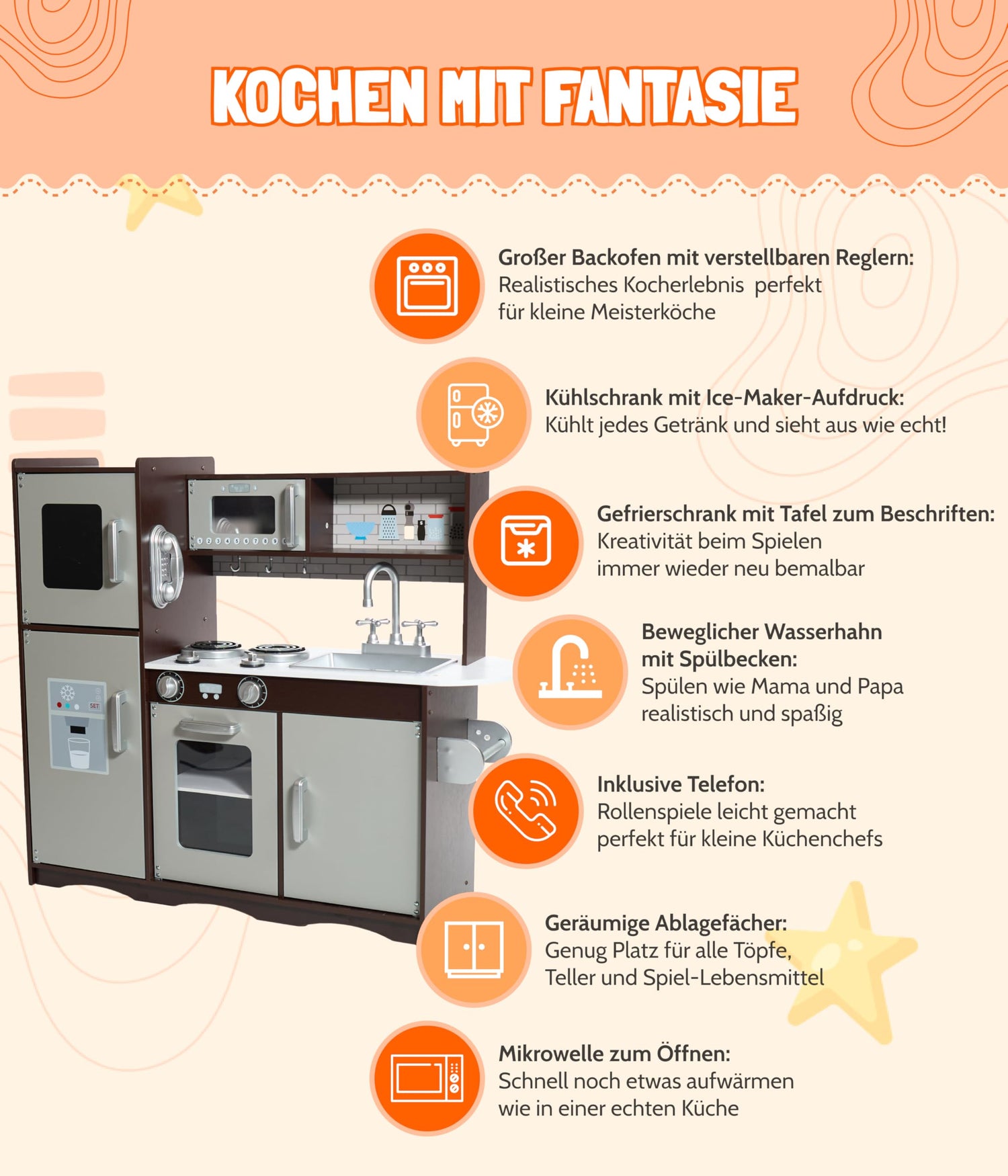 - La hermosa cocina de juegos incluye un congelador con una pizarra para escribir y pintar, una nevera con impresión de una máquina de hielo, un grifo móvil con fregadero, amplios compartimentos de almacenamiento, un horno grande con placas de cocción y reguladores ajustables, un microondas para abrir, así como un teléfono y un toallero