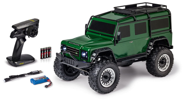 Carson 500404236 1:8 Land Rover Defender 100% RTR British Vert - Voiture radiocommandée, véhicule RC, Batteries et radiocommande incluses, Vitesse km/h, Temps de conduite 20 min