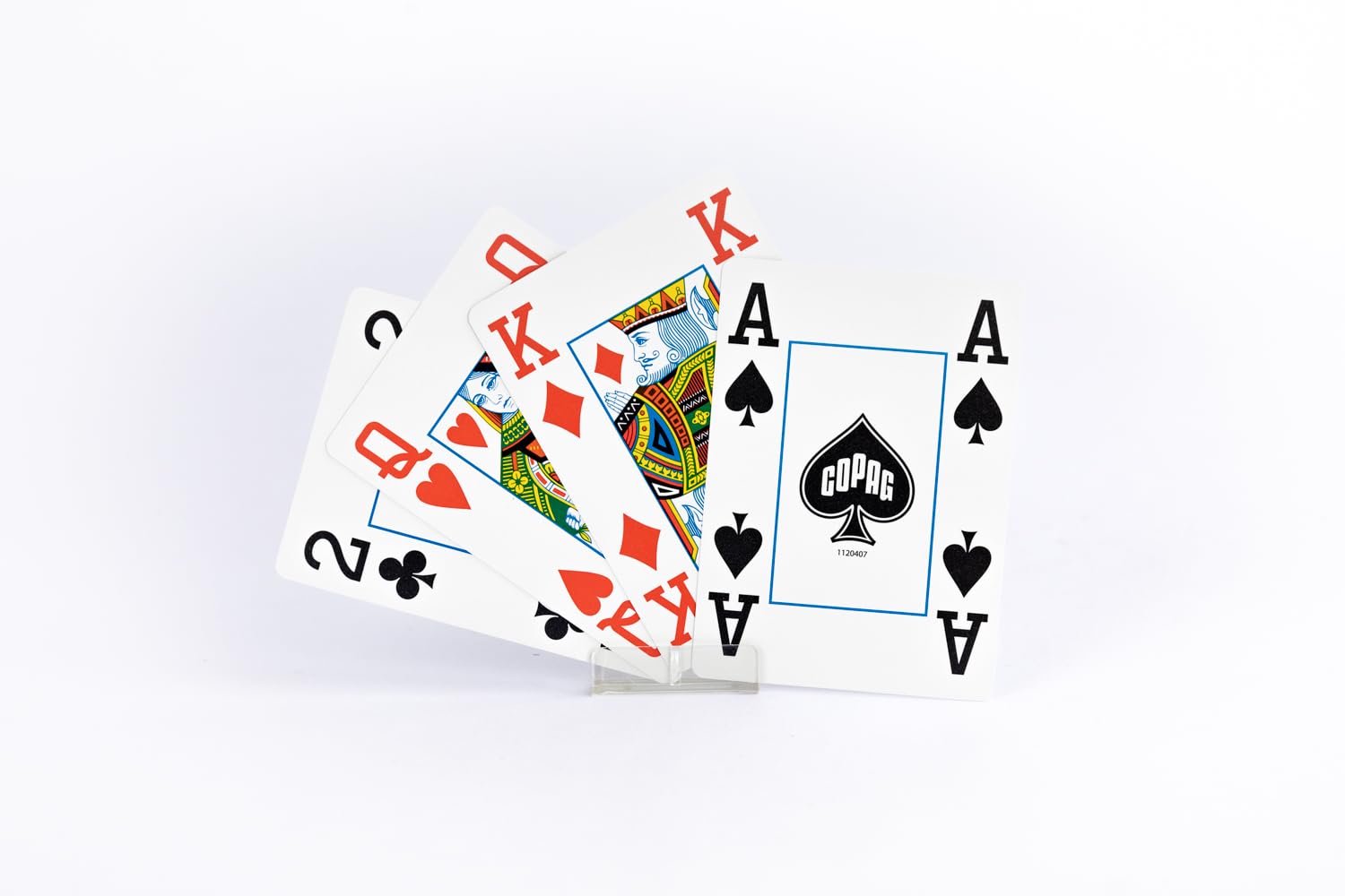 - Cartas Copag de nivel profesional: Incluye 2 barajas tamaño póker (63 x 88 mm) con índice jumbo doble, ideales para partidas de Texas Hold’em y Omaha.