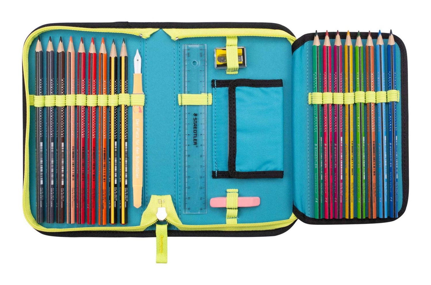 Consta de una cartera con 2 botones y 1 colgante, una bolsa de deporte, un estuche perezoso, una bolsa de estudiante llena de lápices de colores de calidad Staedtler y una caja de folletos. Con luz brillante alrededor del ojo de buey. Adicional: +2 acolchado extra extraíble en la espalda.