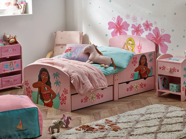 • Embárcate en una aventura con esta cautivadora cama infantil con los queridos personajes de Disney Moana y Rapunzel, adornada con imágenes vibrantes y detalles aventureros