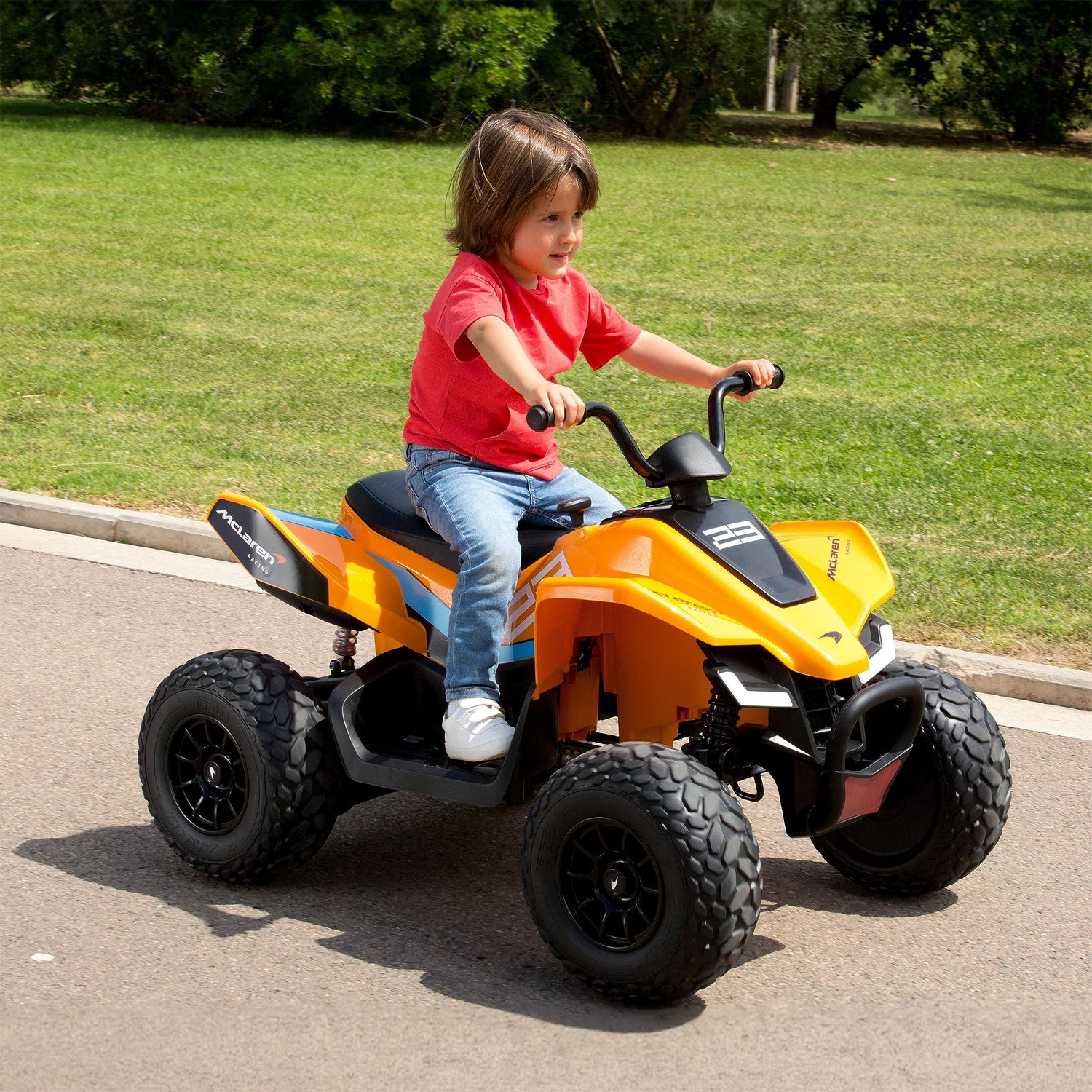 FEBER QUAD McLaren 12V es un quad infantil que funciona con batería de 12 Voltios. Este Quad cuenta con licencia oficial de McLaren y tiene un diseño auténtico vinculado con la marca. Es un juguete de exterior perfecto para pasar tiempo al aire libre en familia. Los niños se sentirán pilotos profesionales ya que tiene marcha adelante y atrás con las que podrán manejar el vehículo como quieran. Es muy fácil de usar ya que se pulsa un botón, se mete marcha, y al pisar acelerador comienza a funcionar. Tiene dos velocidades para adecuar el paseo al gusto del niño o de los padres. Además, a los niños les encantará porque alcanza velocidades entre 3 y 6 km/h. El quad también tiene luces LED que podrán apagar y encender con un solo botón, y lo convierten en un vehículo realista. El quad deportivo cuenta con ruedas de goma EVA que mejora la estabilidad del quad para una conducción más segura para los niños. El juguete incluye lo necesario para poder disfrutar de un paseo divertido en el parque: batería de 12V y un cargador. Un juguete indicado para niños y niñas mayores de 3 años de edad. El peso máximo recomendado es de 30 kilos. Las medidas del producto son: 107 cm (Largo) x 71 cm (Ancho) x 73,5 cm (Alto).