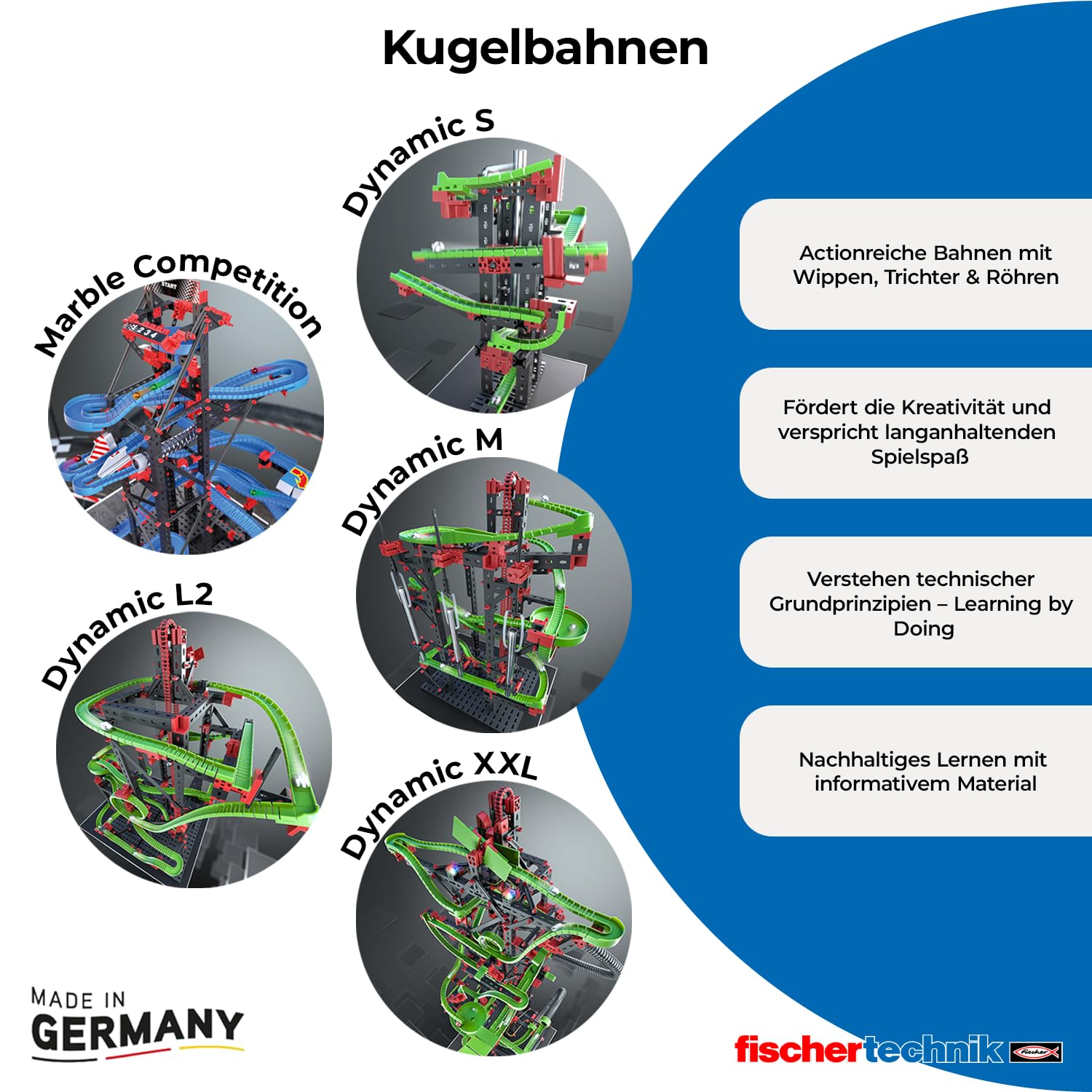 - CONTENIDO DEL PAQUETE: 1 x Competición de Canicas Marble Competition, juguete de exploración para niños a partir de 8 años, pista de carreras para canicas para ensamblar con 697 piezas de fischertechnik, fabricado en Alemania.