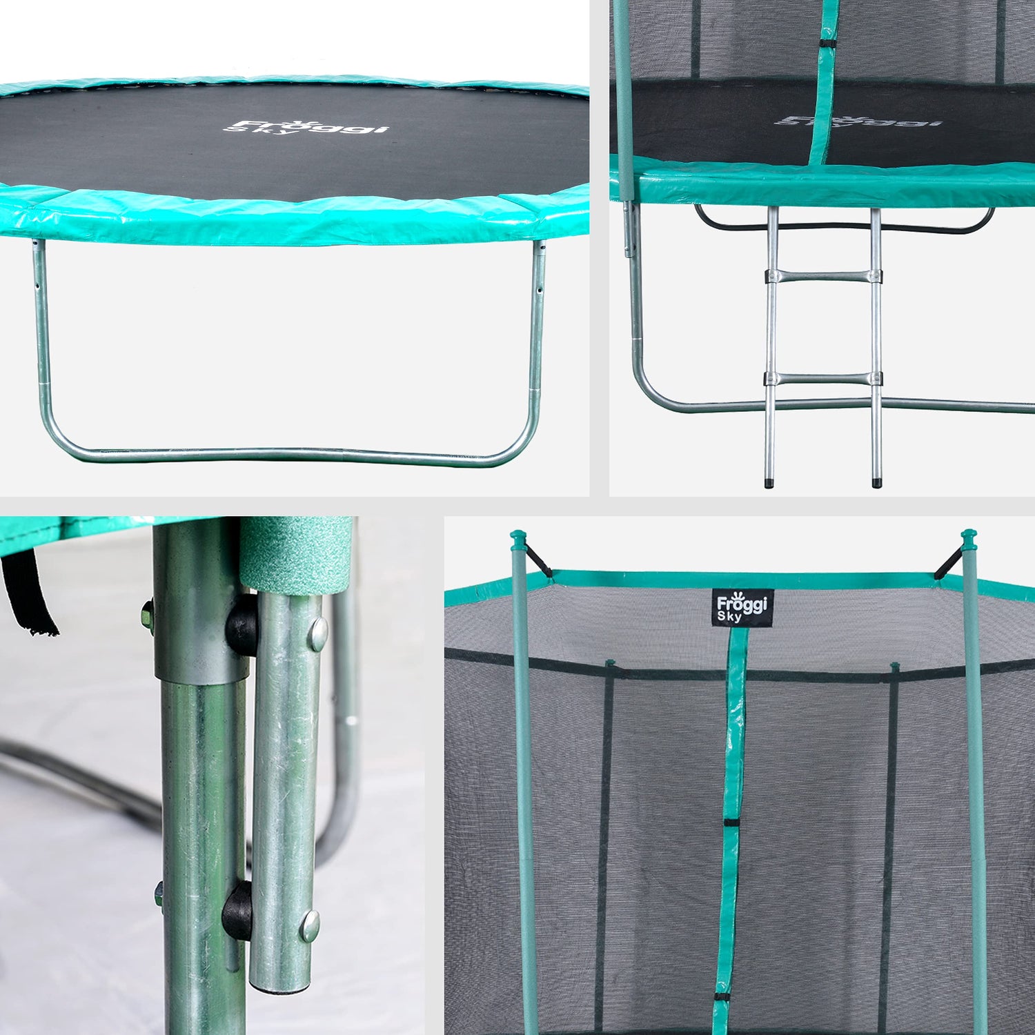 - Modelo redondo. Cierre central seguro. Diámetro del tubo: 25 x 1,0 mm. Altura del suelo: 50 cm. Número de patas 3 (diámetro 34 x 1,2 mm). Diámetro de la alfombra de salto: 150 cm.
