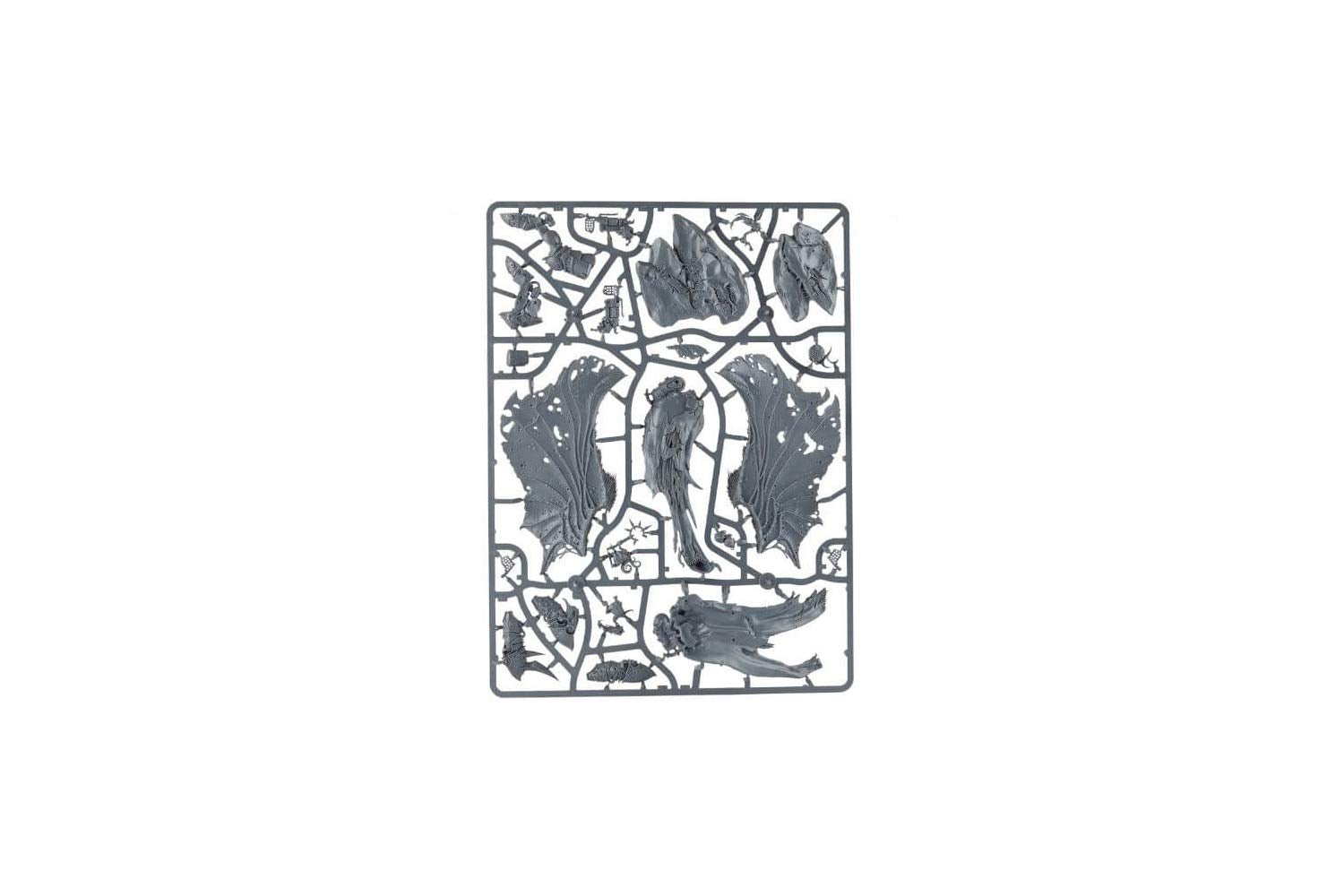 Durante diez mil años, Mortarion, Señor de la Guardia de la Muerte, ha aplastado a sus enemigos en el campo de batalla. Rodeado de ácaros del demonio, moscas zánganas y vapores nocivos de la peste, Mortarion se precipita a la batalla en enormes alas crujientes. el golpeteo de estos piñones sucios llena al enemigo de rastas rastreras, incluso mientras mueven el olor a muerte a través de sus líneas. Incluso pararse en la presencia del Señor de la Muerte es letal, los oponentes se ahogan y colapsan mientras sucumben a la miríada de plagas que agitan el aire a su alrededor. Este kit de plástico multiparte contiene los componentes necesarios para montar Mortarion, Daemon Primarch of Nurgle. Este es un modelo imponente: la palabra "miniatura" apenas le hace justicia, ya que se cierne sobre el resto de la Guardia de la Muerte y le da incluso a los Sterneros de Sangre algo que admirar. Está vestido con una armadura de poder barroca conocida como la Placa Barbarana; esta está cubierta de óxido y podredumbre, con calaveras, picos y simbolismo Nurgle en cada uno de los componentes gruesos. De esta armadura cuelgan túnicas moldeadoras, cadenas y una capucha podrida, cubriendo parcialmente el sistema de tuberías que alimentan su aparato de respiración; es seguro asumir que este ventilador no está entregando aire fresco y limpio a Mortarion, sino esporas viles y enfermedades. Está armado con 2 armas sucias: una guadaña masiva llamada Silence, una hoja oxidada pero afilada con dientes de cadena brutales, manchada con la sangre de mundos y capaz incluso de hackear a un Titán Reaver en pedazos; y The Lantern, una antigua pistola de energía. Hay dos opciones de modelado para estas armas: una opción presenta las armas hacia abajo al lado de Mortarion, la otra presenta una pose mucho más agresiva. Mortarion cuenta con alas enormes y en descomposición: están modeladas con marcas de viruela, agujeros y desgarros, que representan el