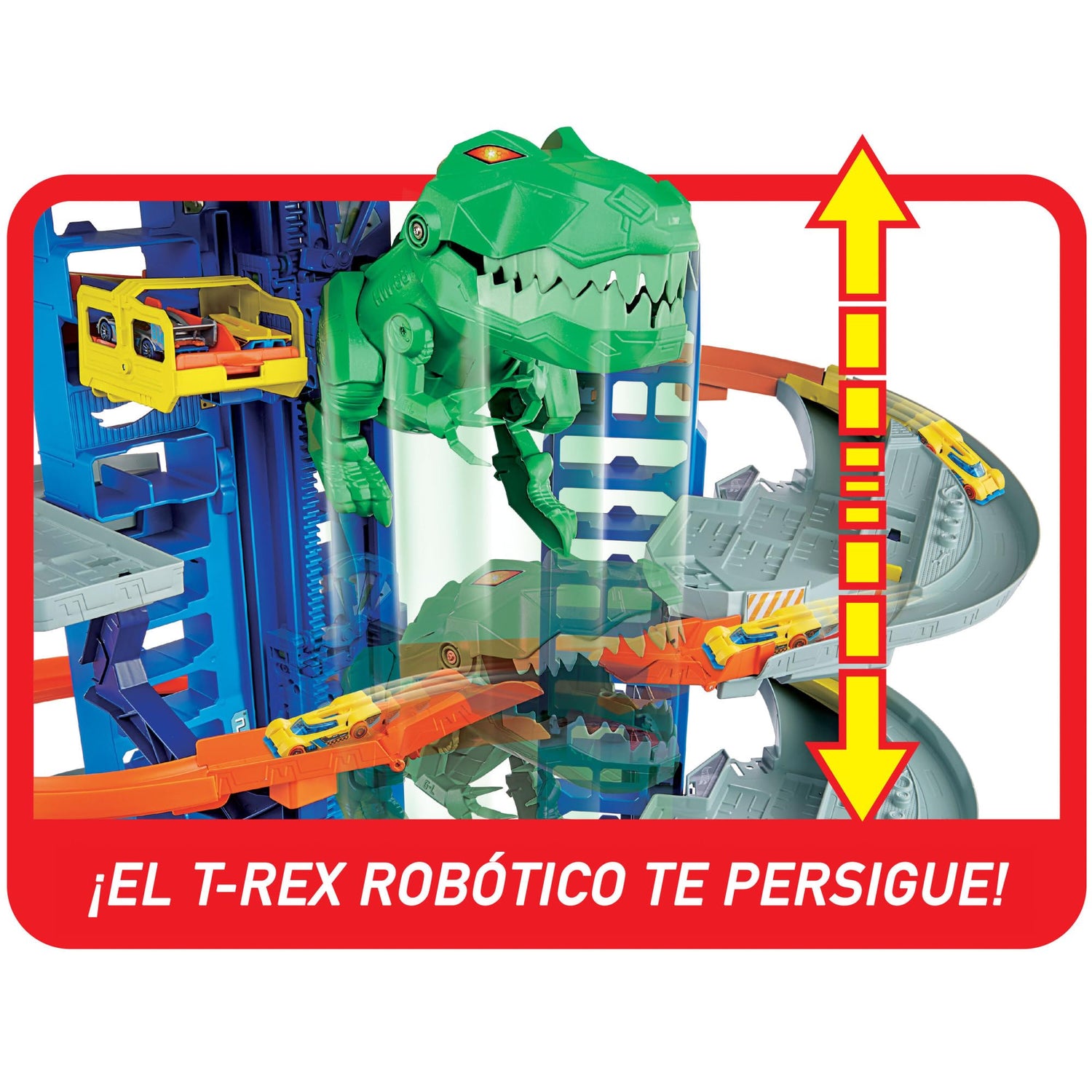 - También existe la oportunidad de incluir algunas funciones especiales de Hot Wheels. Conecta el portal de Hot Wheels (se vende por separado) para escanear un coche, competir contra tus oponentes, escapar del T-Rex robótico y ganar.