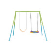 • Diseño: conjunto en color verde, azul y naranja compuesto por un columpio individual con cadenas ajustables en altura (gracias a los mosquetones integrados en la estructura) y un nido circular con borde acolchado sostenido por cuatro cuerdas resistentes