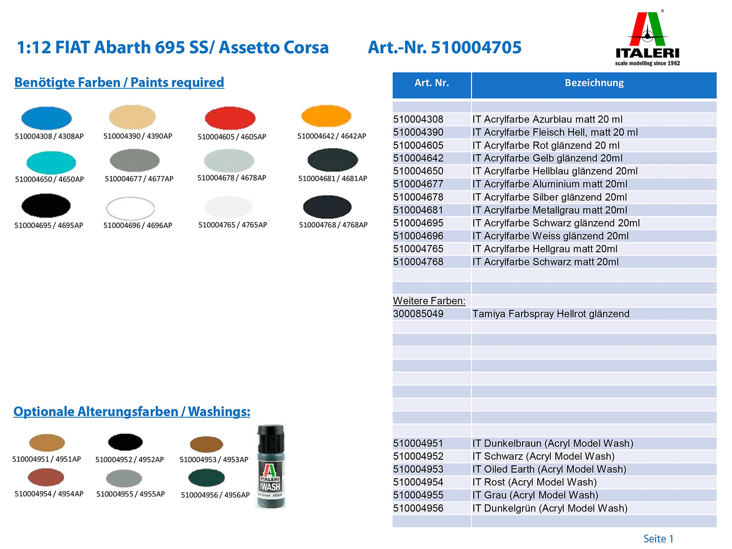 Número de referencia: 510004705. Denominación del artículo: 1:12 Fiat Abarth 695 SS Assetto Corsa, kit de construcción detallado de plástico del modelo Fiat Abarth 695 SS Assetto Corsa, modelos a escala 1:12 y modelos prefabricados de Italia, el fabricante italiano de miniaturas finas, entusiasman desde hace Más de 50 años. Modelador de todo el mundo. Durante los años se han creado una buena reputación y una gran comunidad de seguidores. Italeri produce desde 1962 kits y modelos prefabricados en la más alta calidad y adaptación, en las escalas 1:16 hasta 1:720. Las herramientas, los colores y otros accesorios de Italeri se utilizan entre marcas y gozan de una gran popularidad. Los kits ITALERI se pueden pintar según tus propias ideas. Para terminar se necesitan pinturas, pegamento y herramientas pequeñas. La serie para principiantes My First Model Kit y modelo Set ya contienen colores e incluso herramientas. Incluye pegatinas para 69 versiones. Atención: no recomendado para niños menores de 14 años.